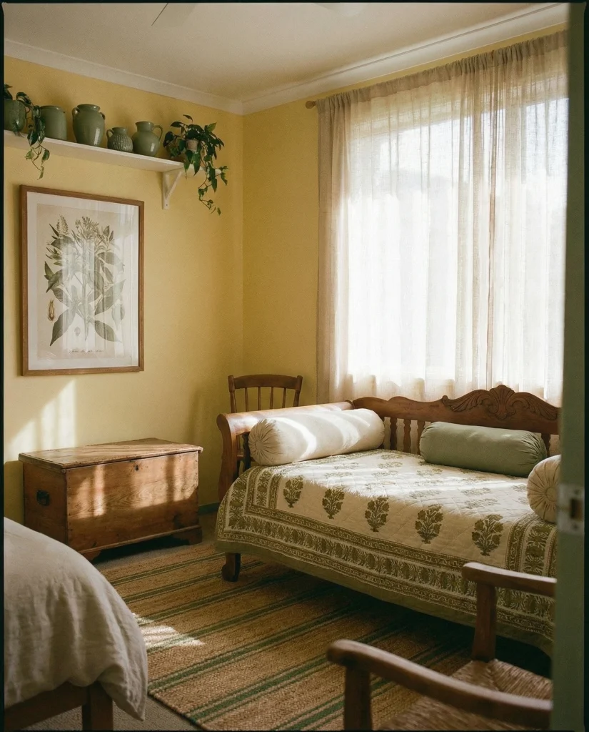 Combining yellow and sage, olive, and cream tones creates a cheerful, uplifting bedroom. This palette suits homeowners who love a sunny, energizing feel without using overly bright colors. Yellow adds warmth, while green provides grounding, making the space feel balanced and welcoming.