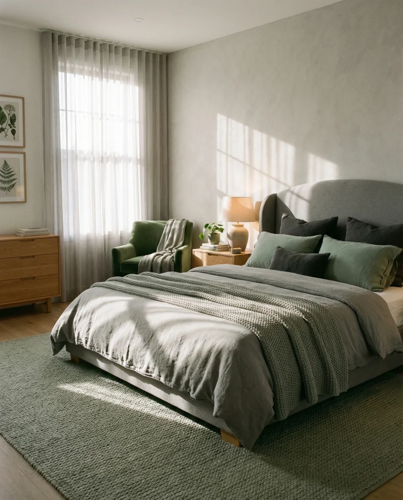 Pairing gray with light, sage, or olive greens creates a sleek, modern bedroom that still feels warm. This idea works well for apartments or contemporary homes with clean architectural lines. Gray smooths the palette, while green adds softness and connection to nature. Interior designers often recommend this combination for people who enjoy modern design but want a more inviting feel.