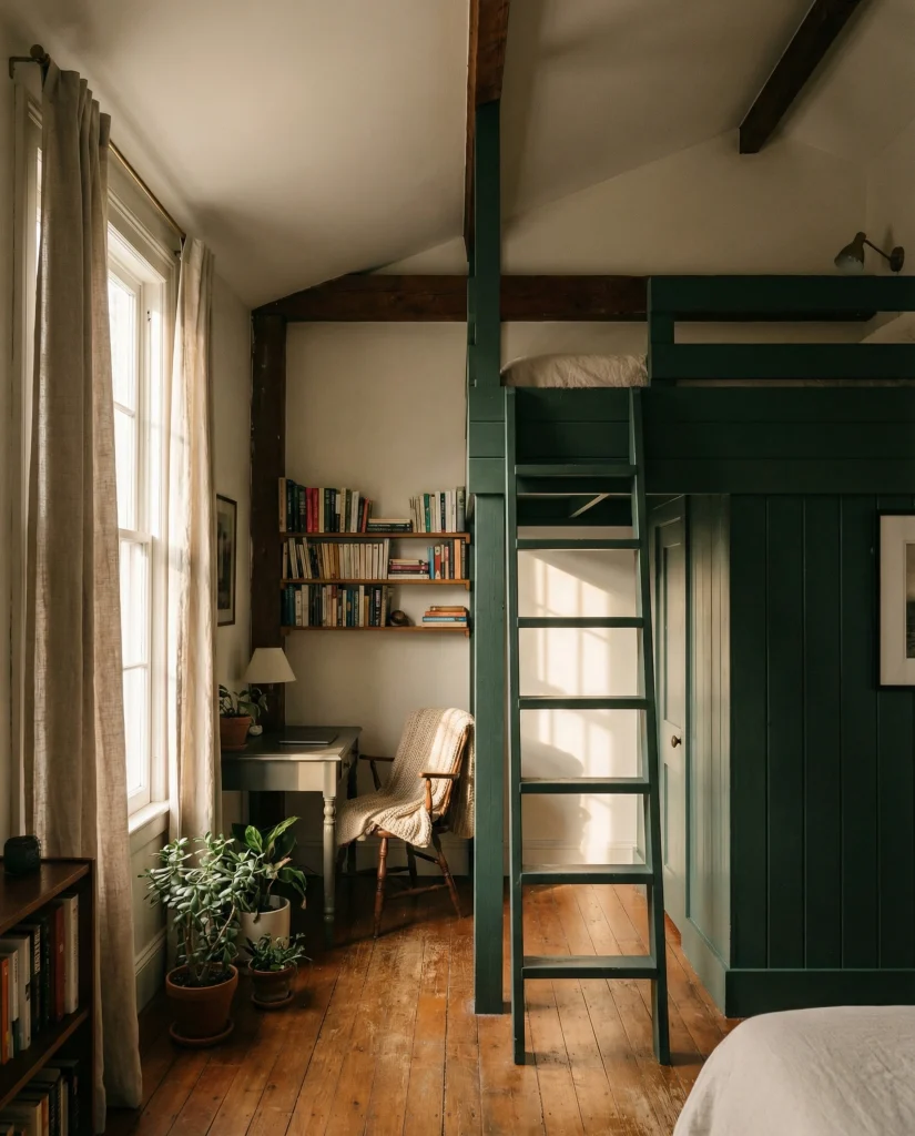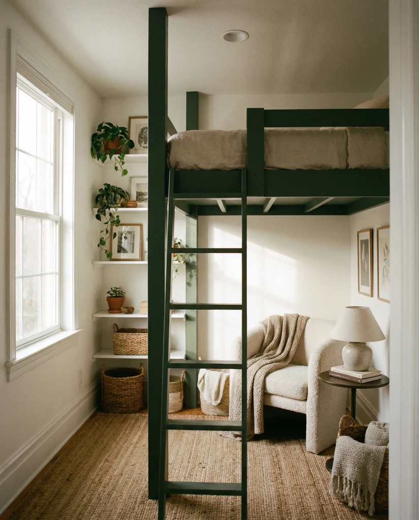 The loft frame next to green tones forms a position of freshness; the one few from the floor speaks of luxurious redemption for all the guests when enough coffee is taken. It’s really the bleach-white throe across its eyes of melange. A friend told me that her guests loved climbing into a high bed since it felt somewhat like a minuscule cousin to an insane tree house. Designers at Livingetc often suggest loft structures in order to buy more floor space using beautiful details.