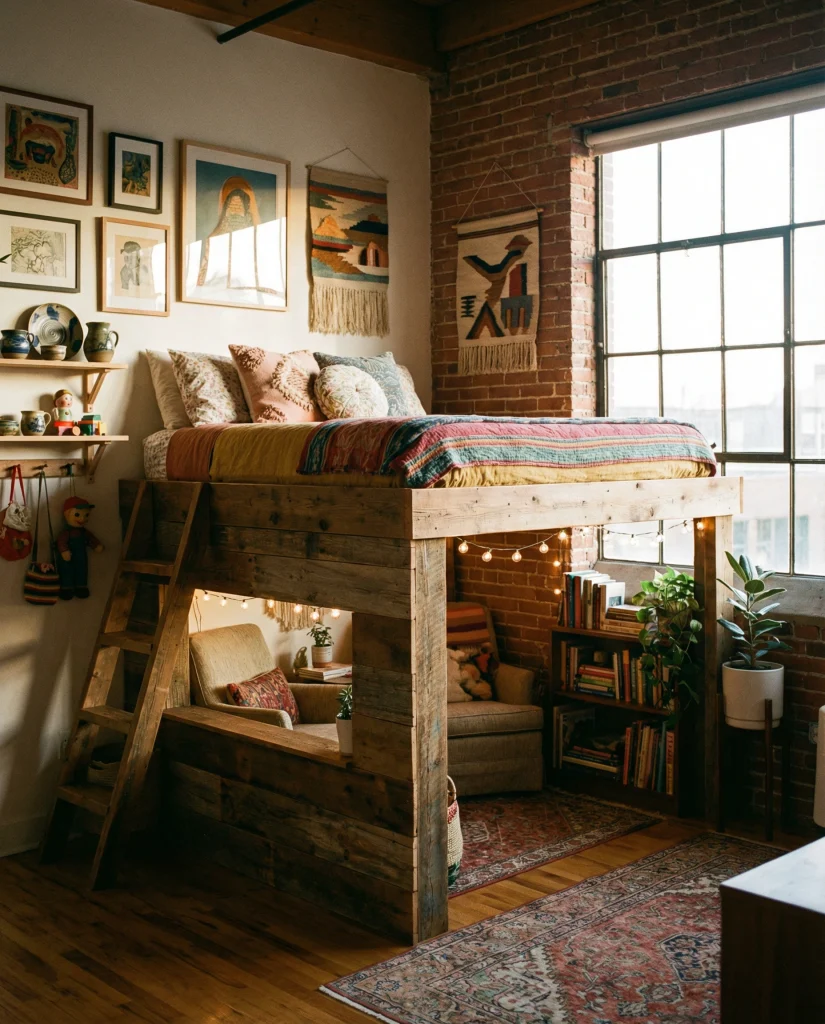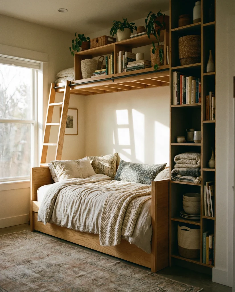 A daybed with loft-style shelving above is quite a clever vertical arrangement to use for small bedrooms. While operated, the shelves bring about some extra storage and give the room some character. Homeowners, since often I have delivered optional plants within the display along with books and other significant material for personal add-ons. The trend of the day for design bloggers and what they love in an indexed manner is its marriage of style and function.
