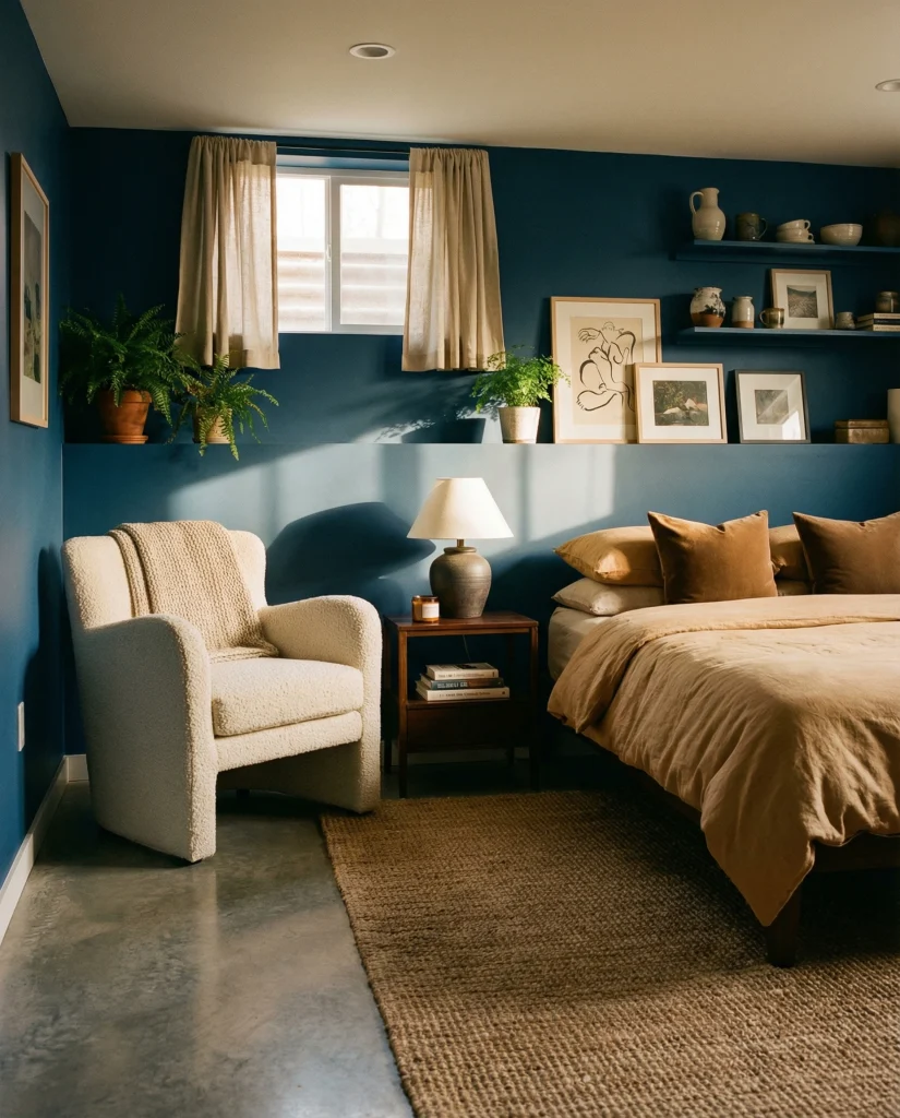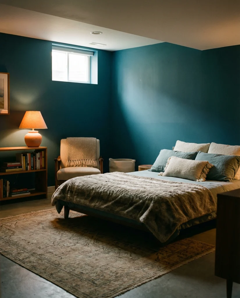 A cozy blue guest lounge in the basement creates a retreat-like atmosphere perfect for unwinding. Soft rugs, layered lighting, and plush seating make the room feel uplifting rather than dark. I’ve seen families use this setup to give guests a quiet escape from the main level. Interior experts often recommend blue for basements because it adds brightness and calm.