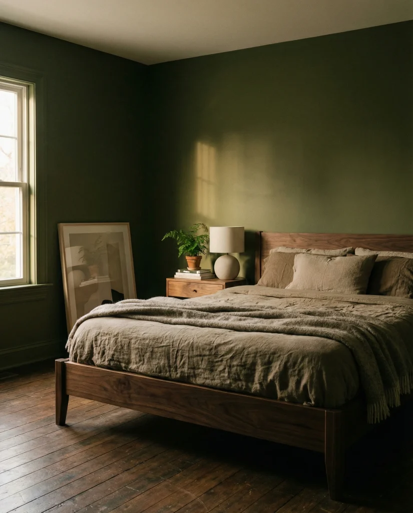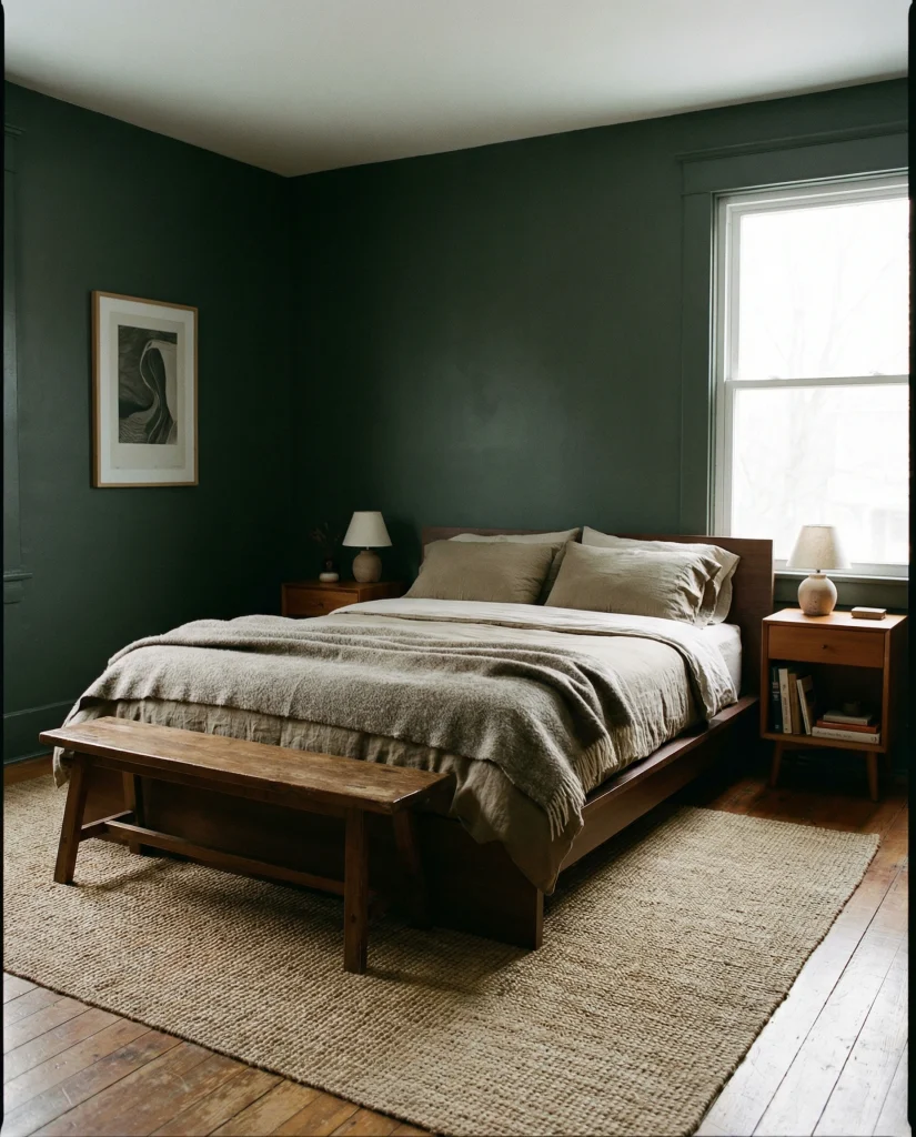 A deep green or moody palette imparts a luxury boutique hotel atmosphere in the basement guest bedroom. I once stayed with friends at a hotel; the color was a dark olive, very warm and romantic. Combining green walls with wood accents and a good choice of bedding allows small rooms to stand tall without making them feel pinched. The experts from Studio McGee typically are more into moody colors to give a room depth and personality.