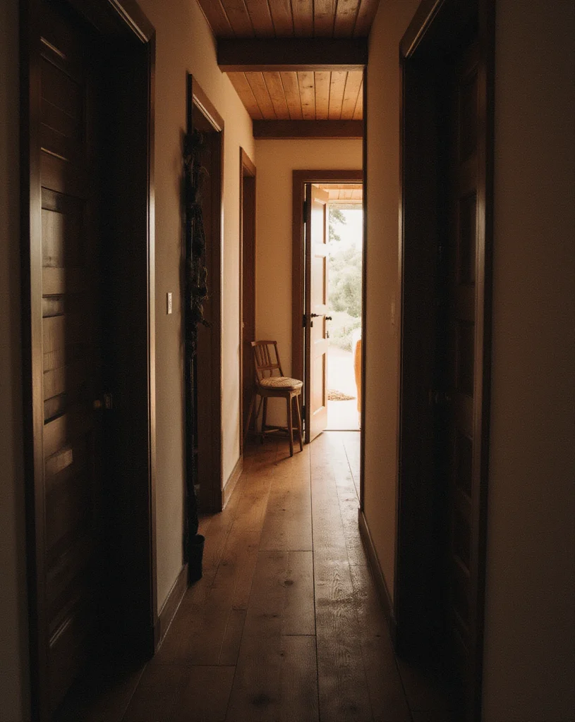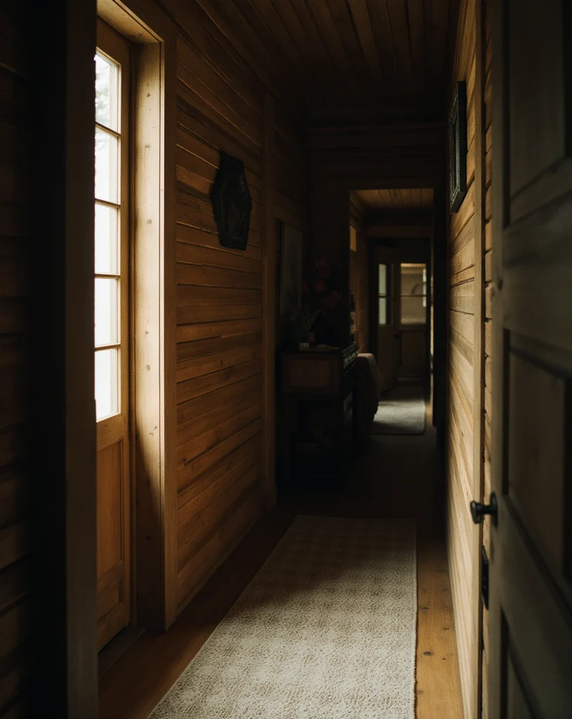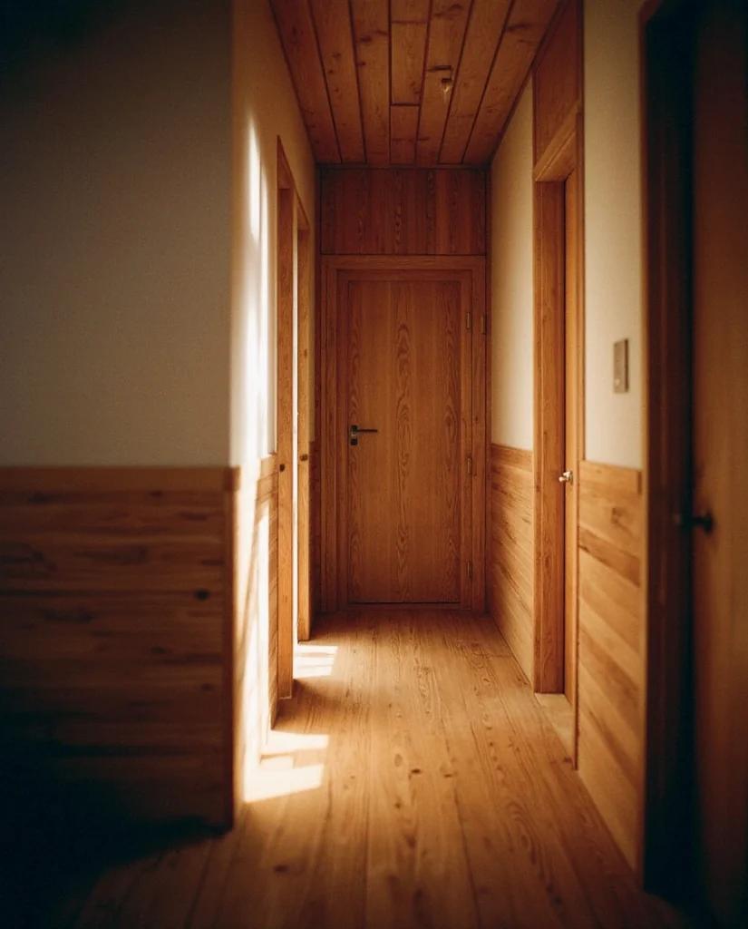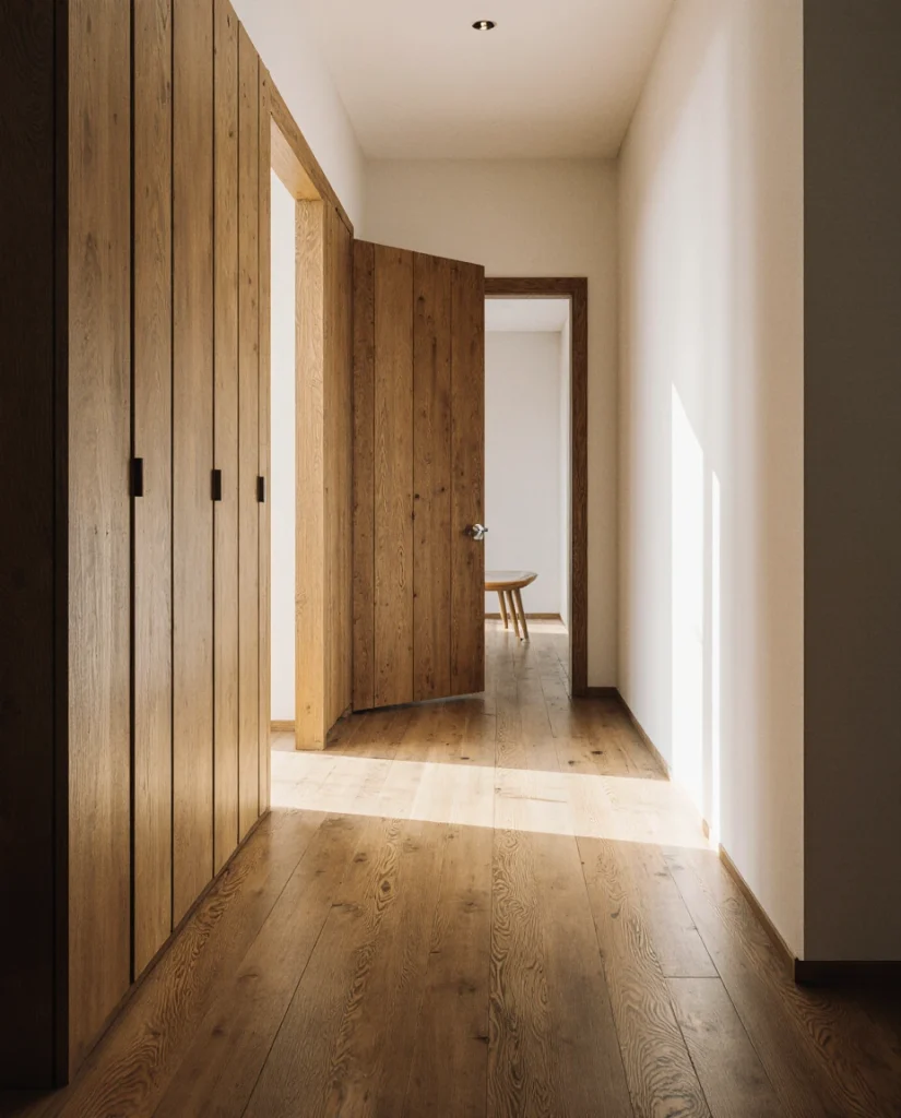 Using colors inspired by natural wood creates a warm, grounded mood in a narrow entrance hall. This style feels calming and works in both small apartments and large homes, especially if your hallway connects to a bedroom or living area. Light and medium wood tones add an organic softness that makes a long corridor feel more inviting.