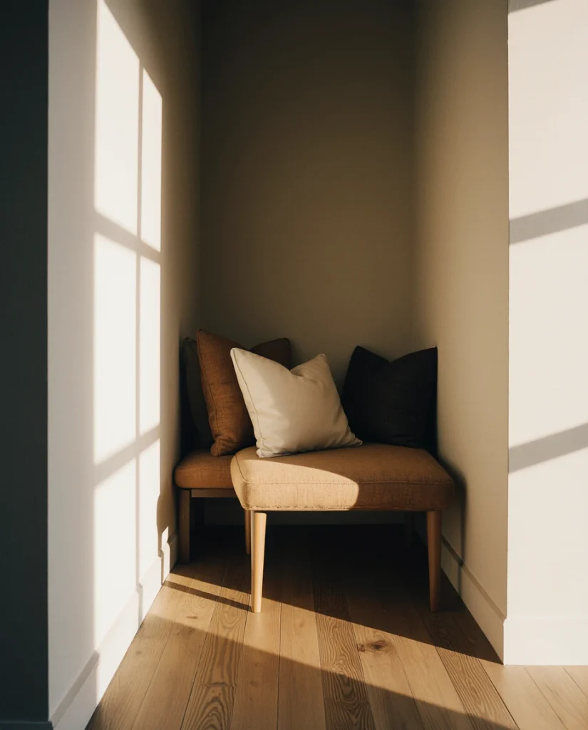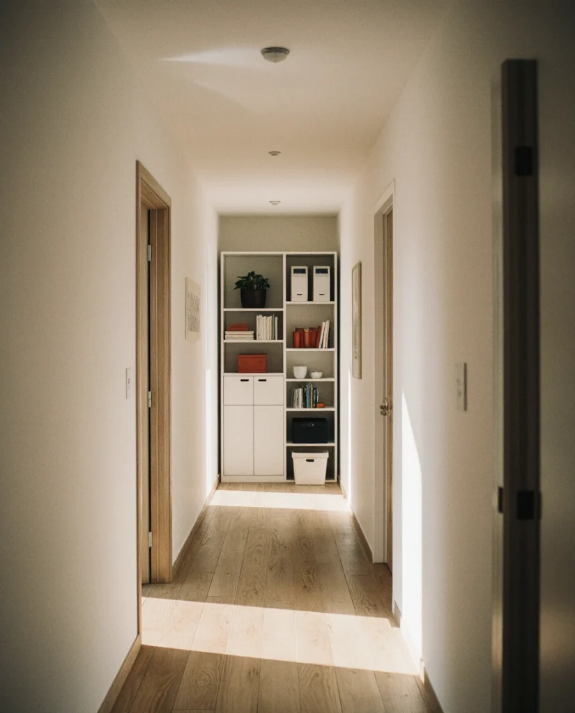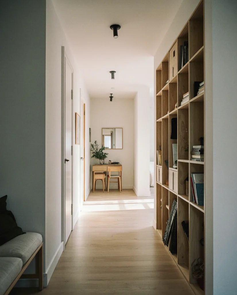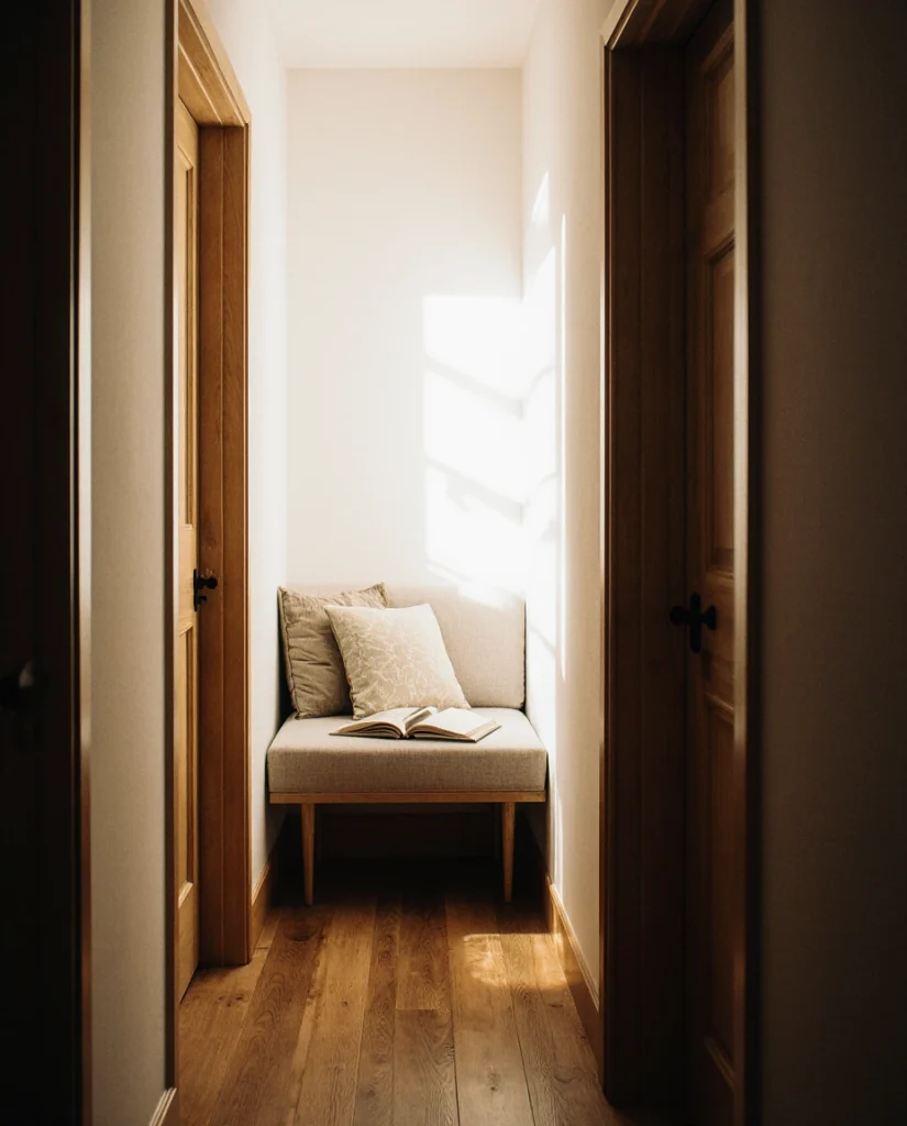 A small corner of a hallway can become a micro reading nook with a slim bench, warm colors, and soft lighting. This works well in long corridors or upstairs areas that feel empty. The idea adds comfort and practicality without crowding the walkway.