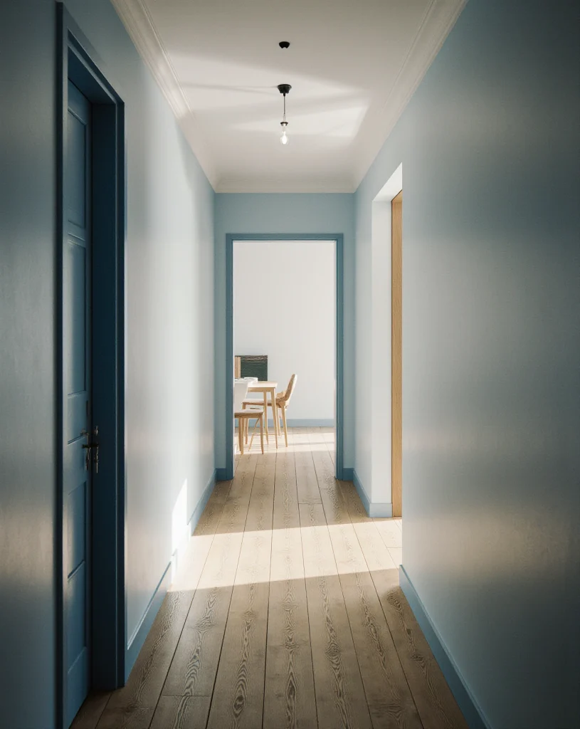 A hallway themed around the sea suits a modern interior where calm tones balance a narrow layout. Soft blues, natural textures, and sandy hues bring peaceful movement similar to a shoreline. This idea works well in small apartments, larger homes, and spaces connecting the living room and bedroom, giving your entrance a refreshing coastal rhythm.