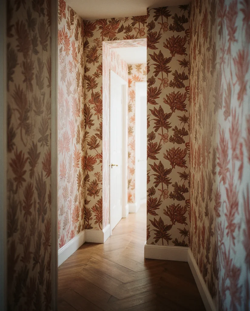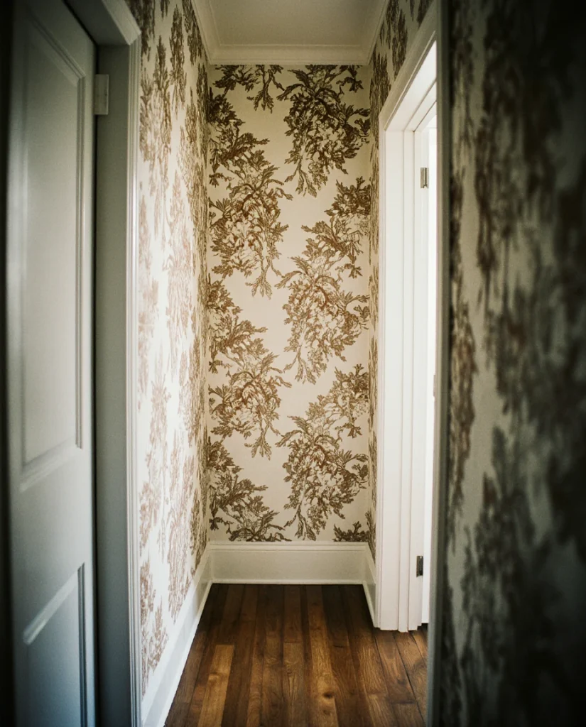 A dramatic large-scale wallpaper print gives personality to even the tightest narrow hallway. Designers often recommend big patterns to create intentional style rather than highlighting small dimensions. This idea suits apartments, starter homes, and even dorm-like layouts, instantly giving your hallway a boutique, curated feel.
