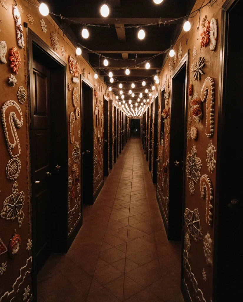 A gingerbread-themed hallway brings warmth and sweetness to a home, especially in long entryways or upstairs stretches. Using caramel tones, candy-like accents, and soft twinkle lights, homeowners create a seasonal path that’s charming but not overwhelming. This style blends well with rustic or modern interiors alike.