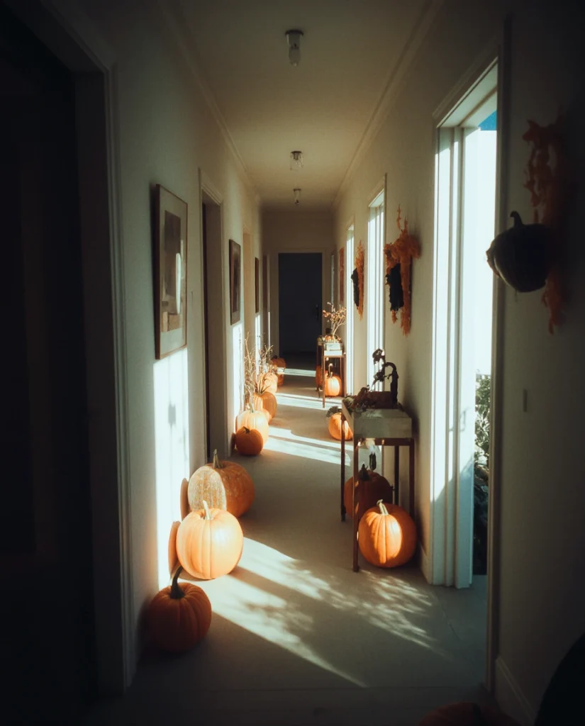 A tasteful Halloween hallway uses moody colors, soft amber lighting, and simple silhouettes to create atmosphere without cluttering a long, narrow walkway. This look is perfect for small apartments, dorm areas, and modern homes where décor must be stylish yet practical. It gives a hint of mystery without feeling childish.