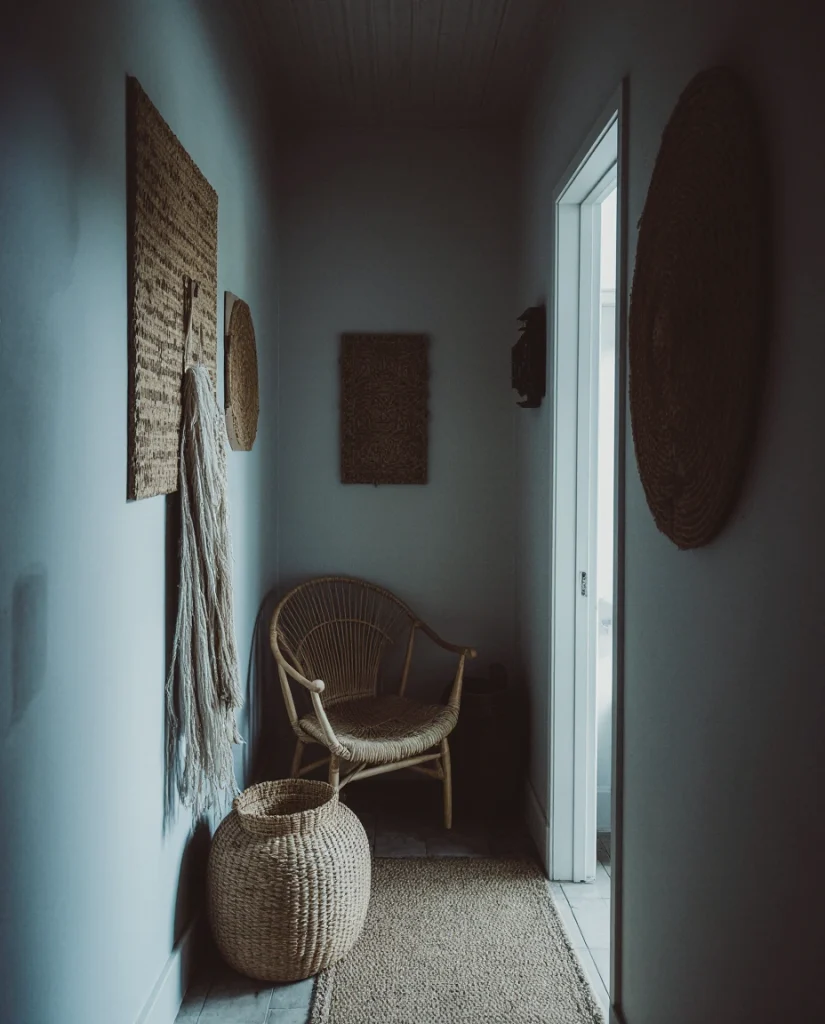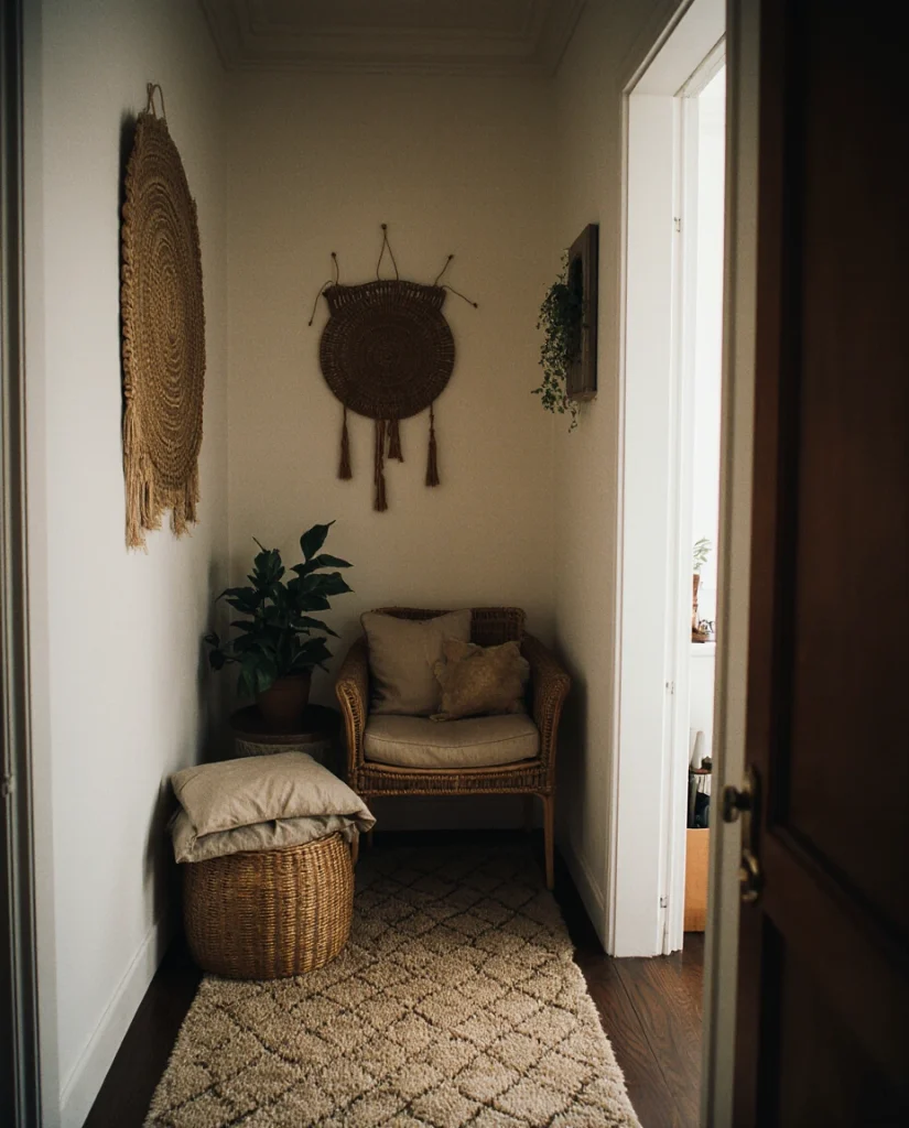 A boho hallway transforms a forgotten corner into a cozy artistic moment. Woven textures, earthy colors, and relaxed styling give personality to narrow spaces that link living areas and the bedroom. This style appeals to people who love craftsmanship, warm tones, and a laid-back approach to decorating that still feels curated.