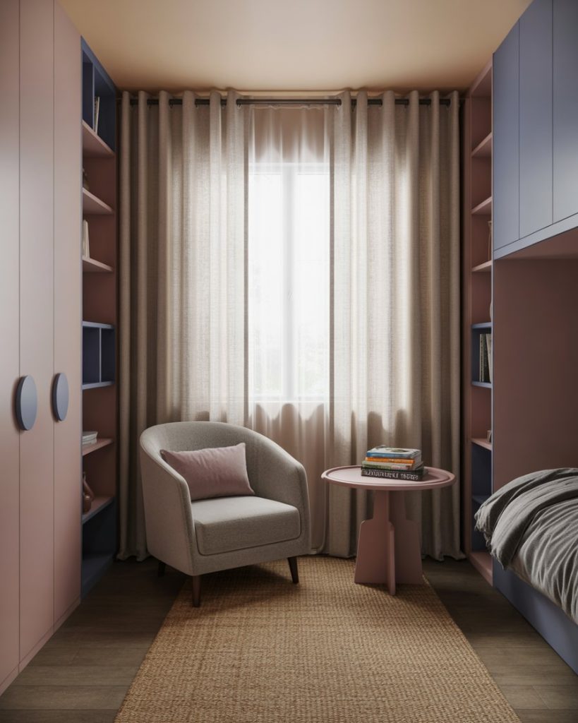 As children get older, their taste in design shifts from playful to personal. A straightforward, neutral, or darker blue-or-purple kind of room feels more grown-up but remains totally user-friendly. It really works for small 2 or smaller compact spaces because older kids appreciate slim storage rather than chunky décor. Draw inspiration from Bloxburg builds or Sims 4 creations for layouts that marry gaming aesthetics with real-world practicality.