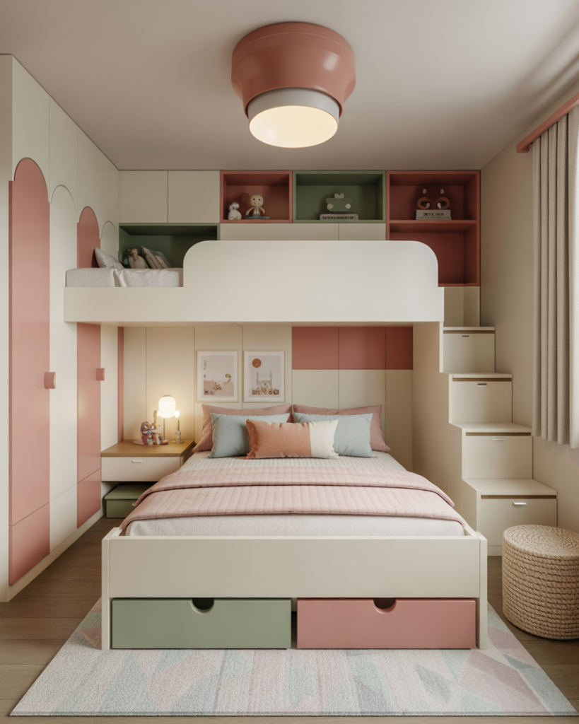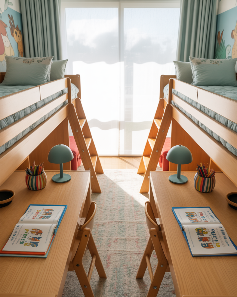 Multi-functional bedrooms cater to sleeping, study, and play areas all in one fold. In cases of families with shared room 2 setups, the division of the space into clearly defined zones plays into the focus of the kids. Ikea loft beds with desks underneath make the overall design quite straightforward yet very effective. Neutral backdrops paired with lovely yet colorful accessories offer kids a choice to personalize their side of the room, hence suitable for both older and younger children.