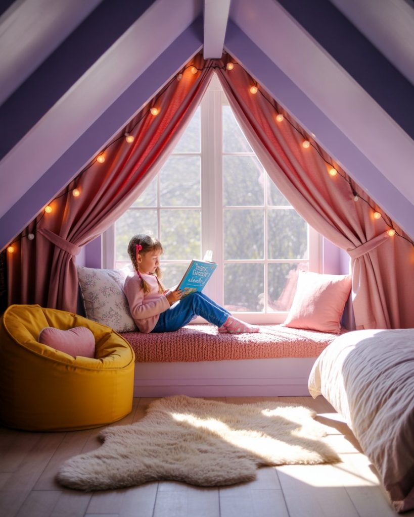 Moving an attic to a bedroom guarantees a secret hideaway for kids. Sloped ceilings and nooks morph into reading corners or play dens. Keep it fun with pops of pink, yellow, or purple, but keep the furniture neutral to balance the look. This set-up is a great solution for older kids who want their independence and power to shape their own little world.