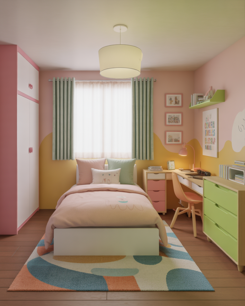 Digital worlds like Bloxburg have become somewhat unexpected points of reference in designing. Kids recreate their favorite cool builds in real life; from themed bunk beds to patterned rugs. Generally, this look balances cute details, bright multicolor palettes, and creative storage to the max of a small room. Inspired by gaming, it is a playful way to combine fantasy with reality and on the other hand maintain the room practical and personal.