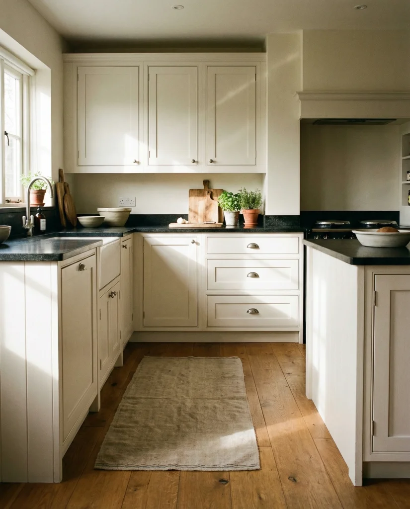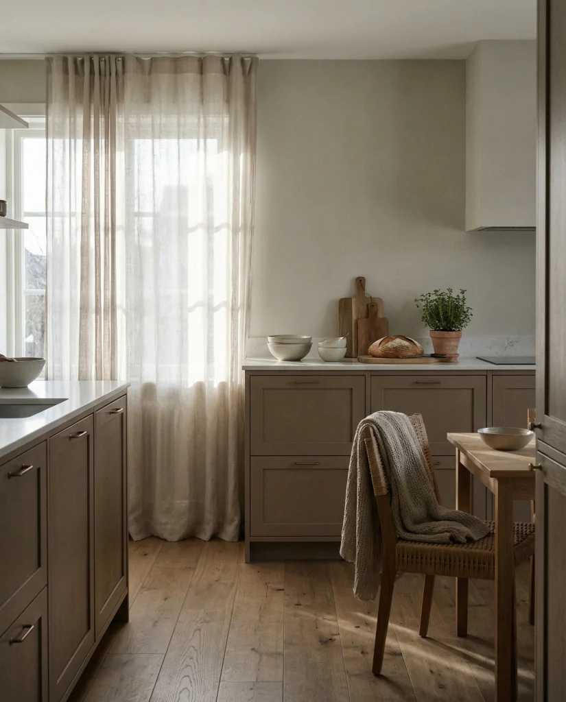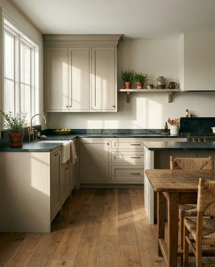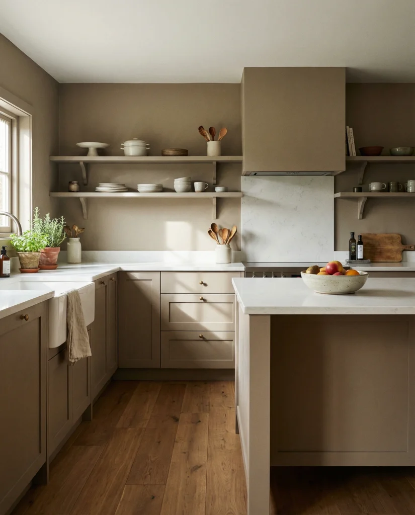 Earthy taupe cabinetry offers a gentle touch of color while staying neutral. The tone works well with wood floor warmth and white countertop simplicity, creating a welcoming look that feels collected but modern. Many bloggers point out that taupe avoids the flatness of beige while remaining easy to coordinate with existing décor.