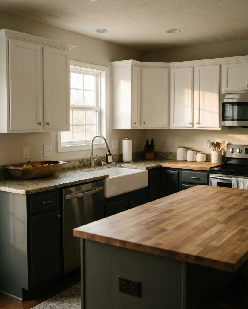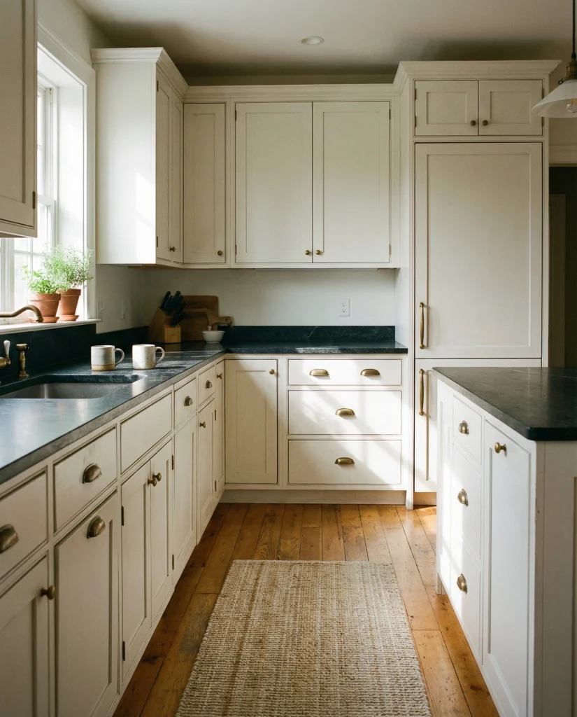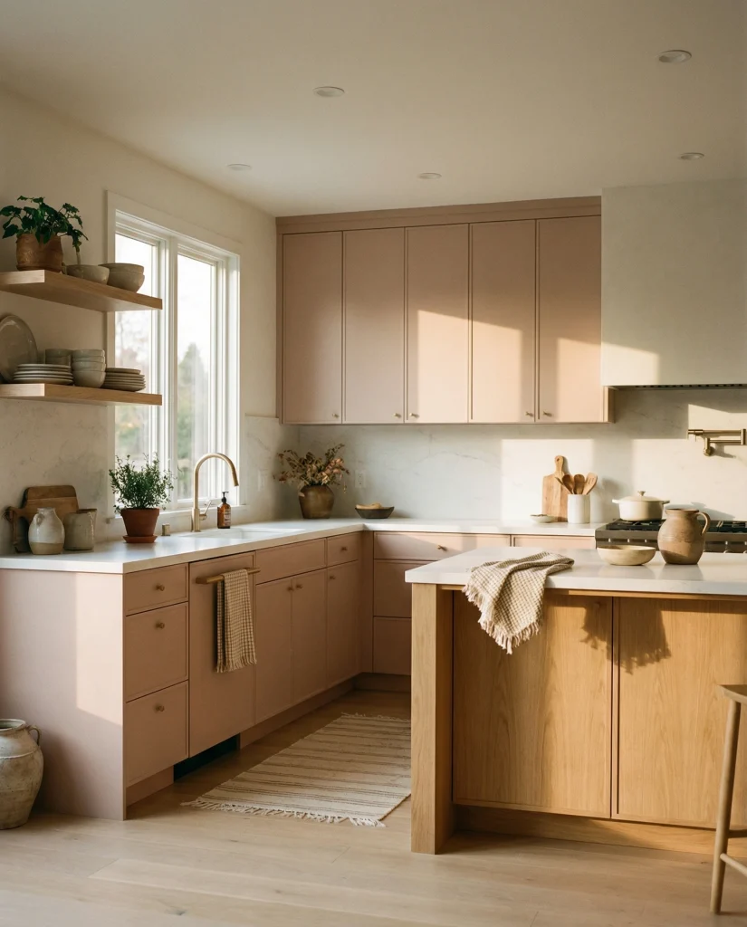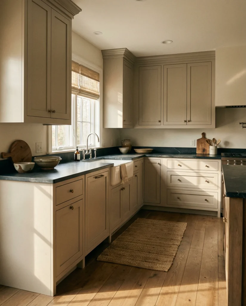 Putty-toned cabinetry blends tone elements of gray and brown for a grounded, earthy appearance. It complements wood floor warmth and dark countertops, making it ideal for transitional spaces. This subtle shade has become popular among Americans wanting simplicity with a modern twist in 2026 kitchens.