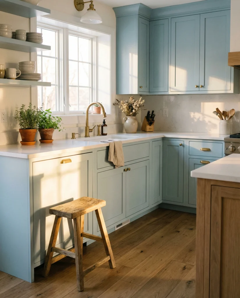 A soft pastel tone of blue can offer small or big kitchens a breezy feel. When paired with white counter finishes and the warmth of wood, this palette is gentle but uplifting. It’s the blog editors discussing that pastel blues are an easy choice for homeowners who love to keep the demanding bright wines of the year in Paint 2026.