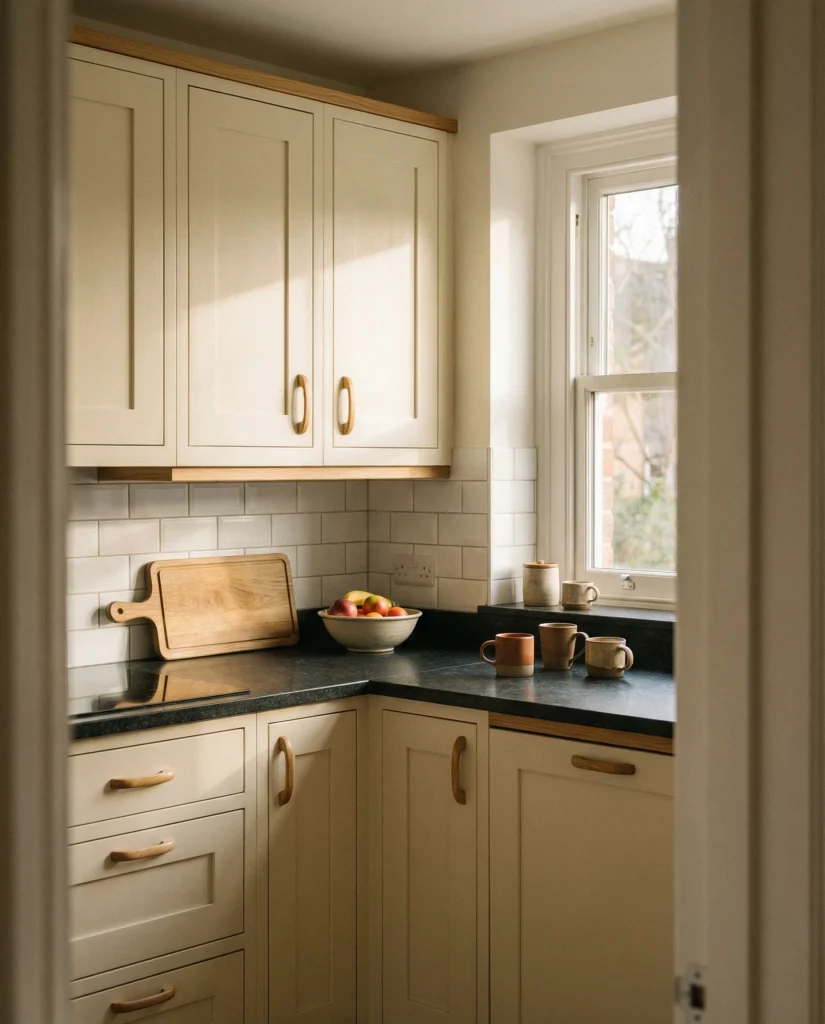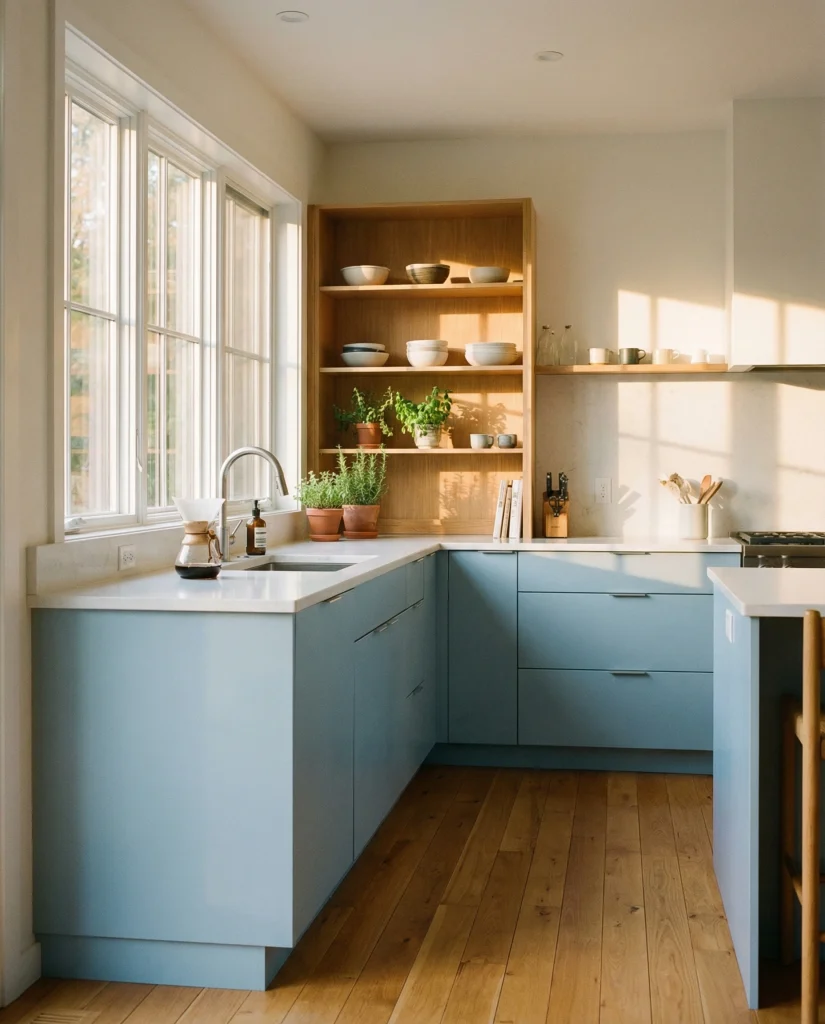 Muted green cabinetry is increasingly popular for those who prefer calm, nature-inspired palettes. With white glossy countertops or soft wood stains, green painted cabinets certainly look refreshing with a slightly grounded feel. Many decorators have mentioned that these colors also make even compact kitchens feel more relaxed and emotionally warm.