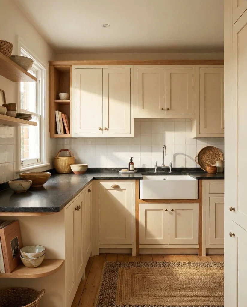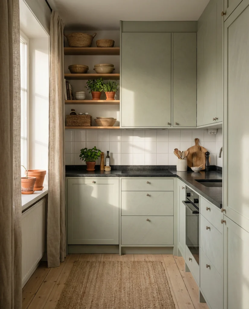 Pale green sage cabinetry blends beautifully with natural stone features and pairs well with dark countertops or white countertop finishes. This shade brings peaceful cottage-like calm while still fitting modern 2026 aesthetics. Designers note it’s an effortless way to introduce color without overwhelming a compact layout.