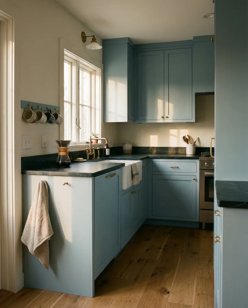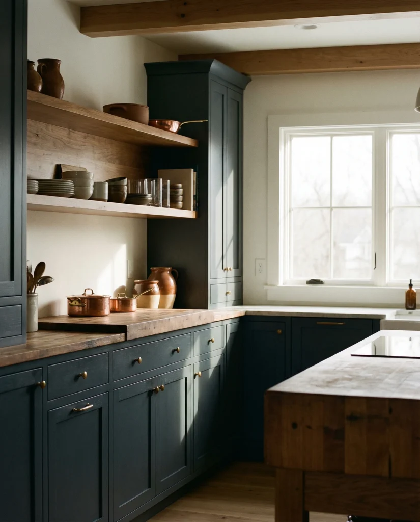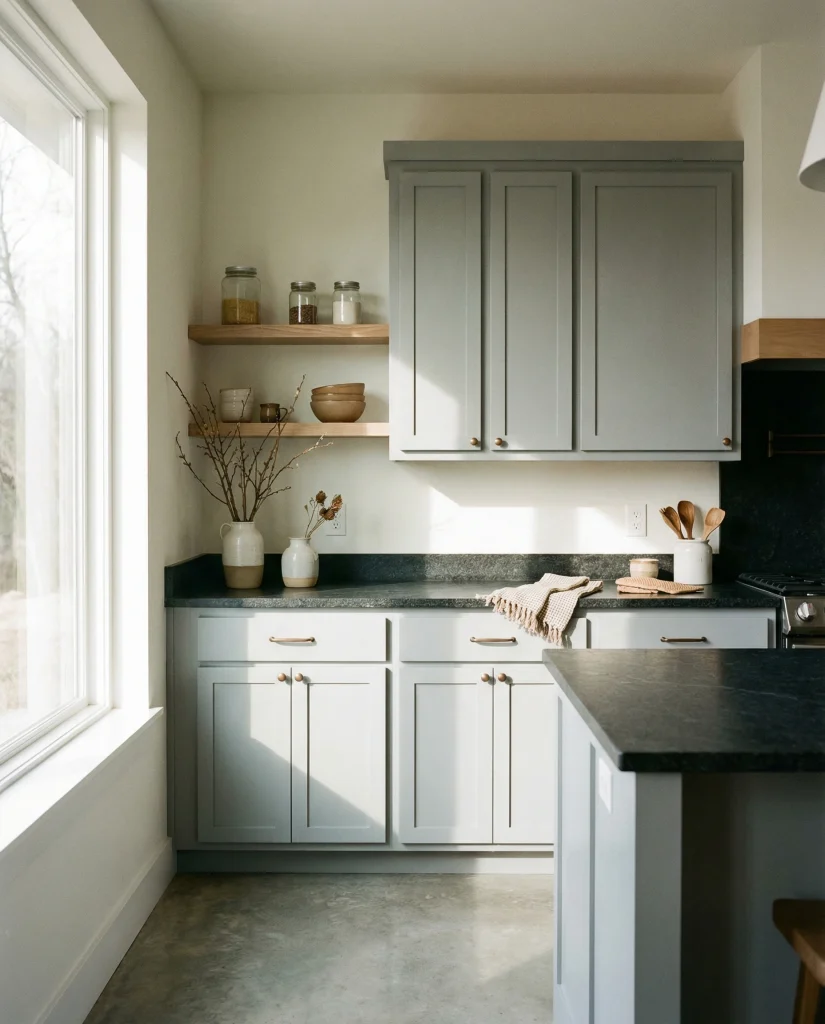 A charcoal-blue blend offers depth while keeping a hint of color. This hybrid works with dark countertops, wood accents, and concrete floors, creating a modern coastal-meets-urban feel. It’s a strong choice for those who want drama without committing fully to dark gray or pure navy.