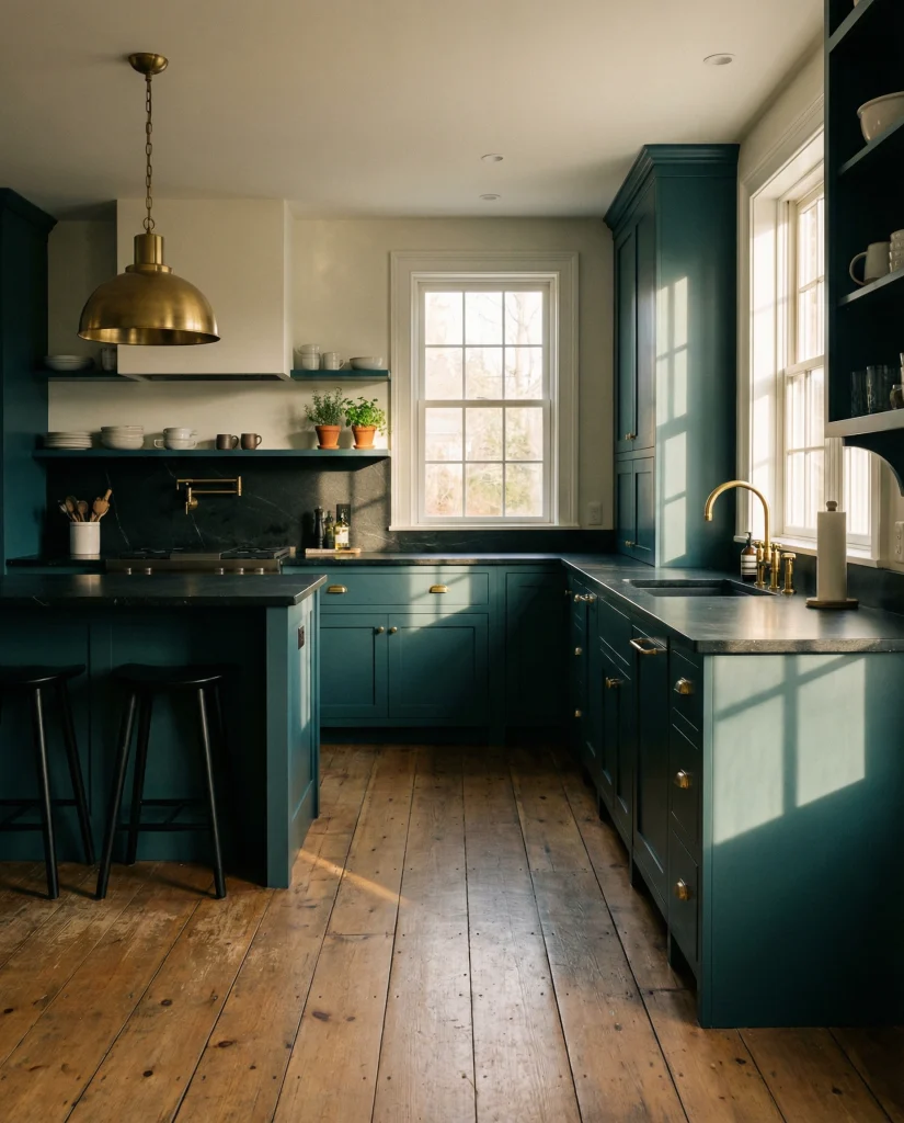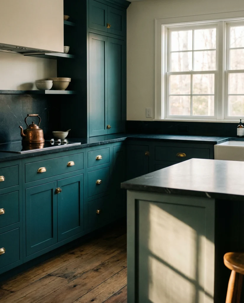 Deep teal cabinetry mixes boldness and sophistication, pairing beautifully with black slab finishes, brass hardware, or wood floor warmth. This moody shade is often featured in designer showcases for 2026, offering drama without the heaviness of pure black. It shines especially in well-lit kitchens.