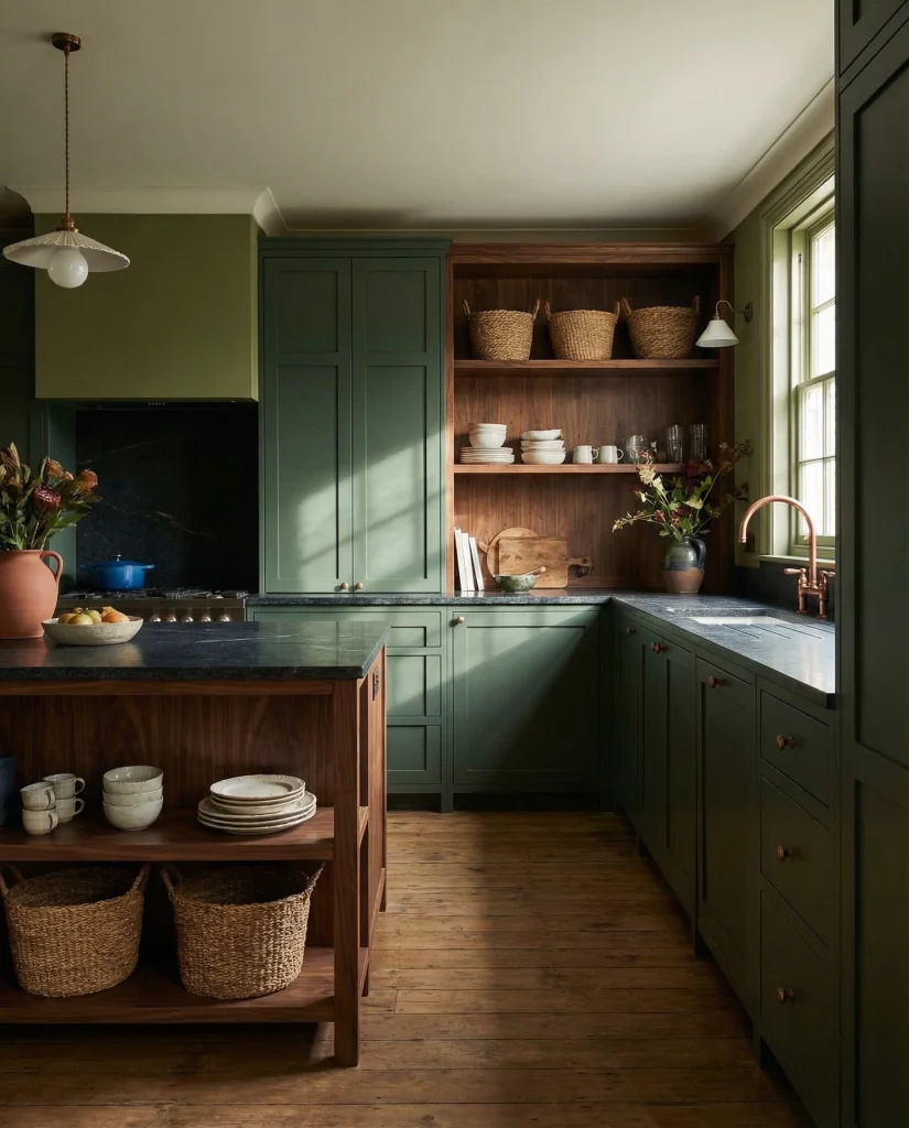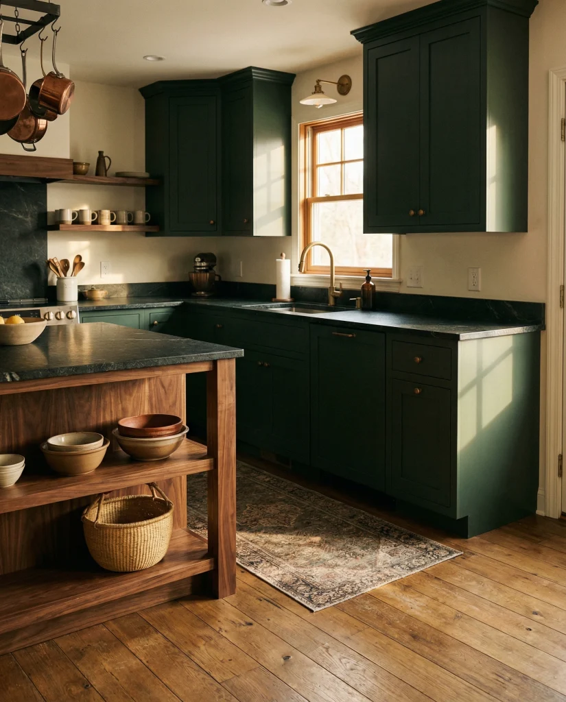 Forest Green cabinetry brings dramatic character while still feeling natural. It pairs beautifully with dark granite counters, brass hardware, and darker wood tones. Designers say this shade works well in both vintage and modern styles, making it a flexible choice with a strong visual impact.