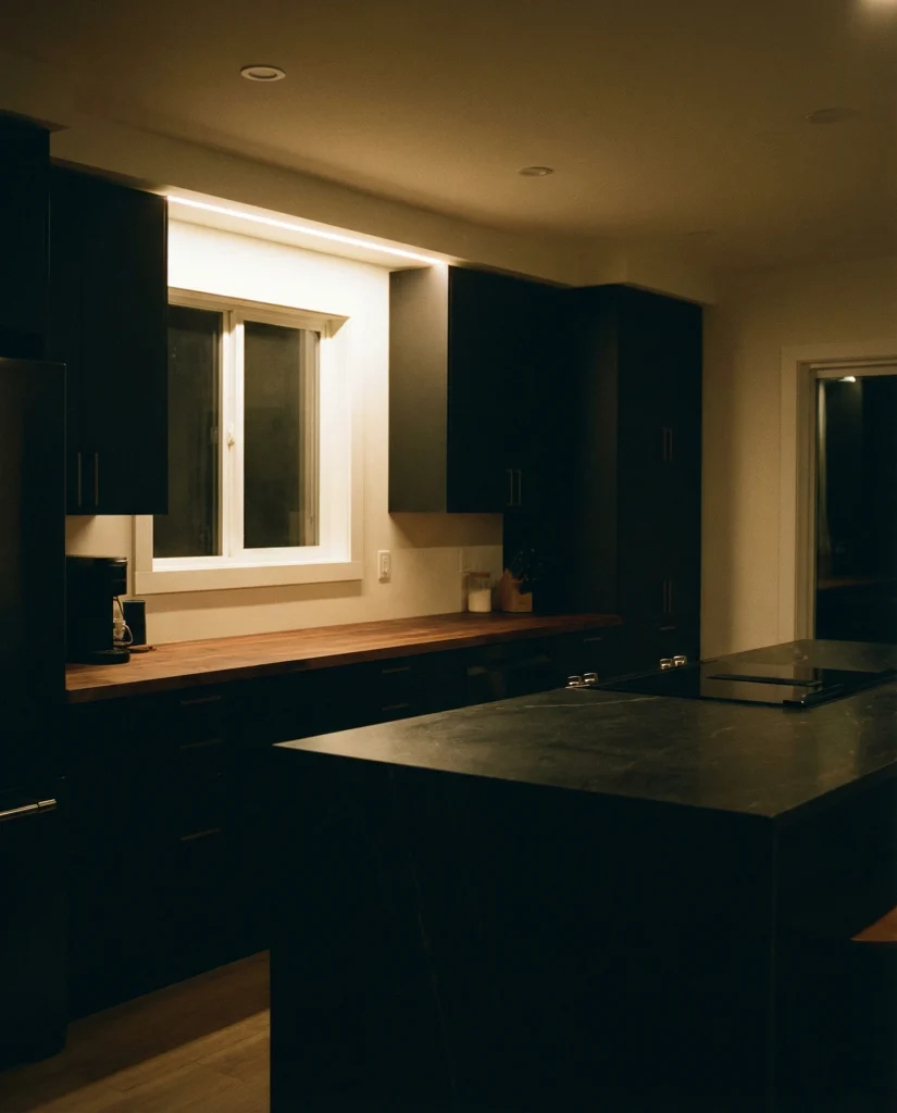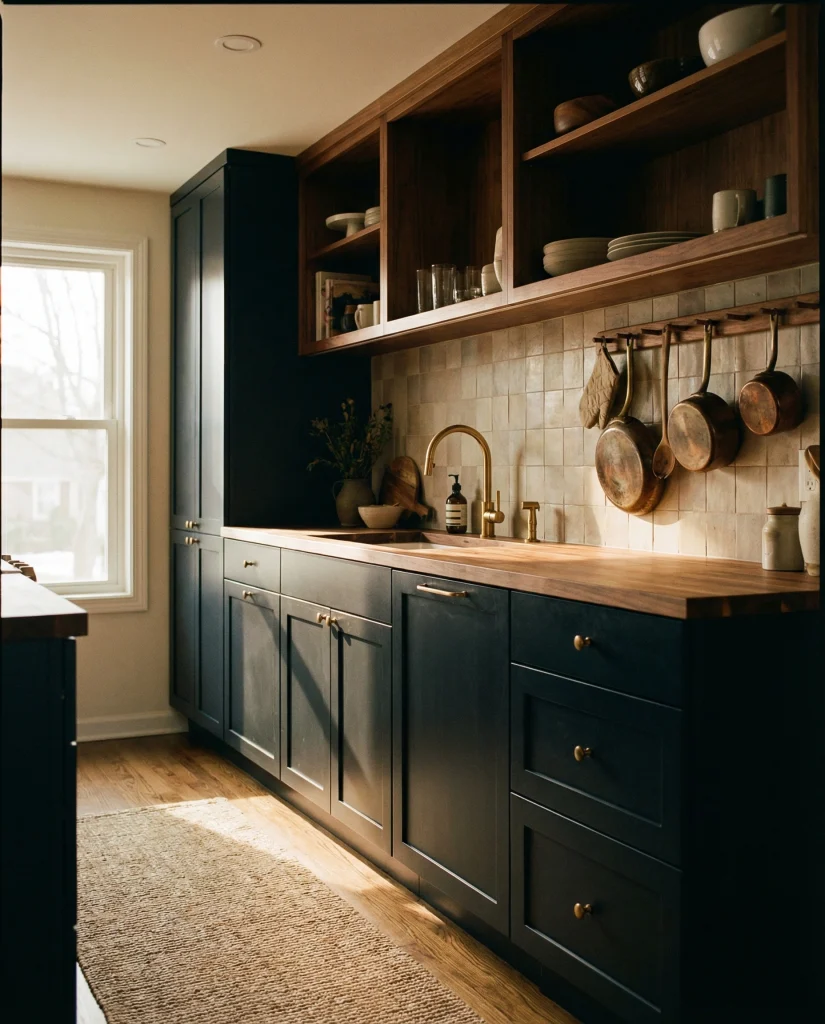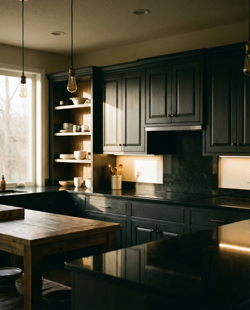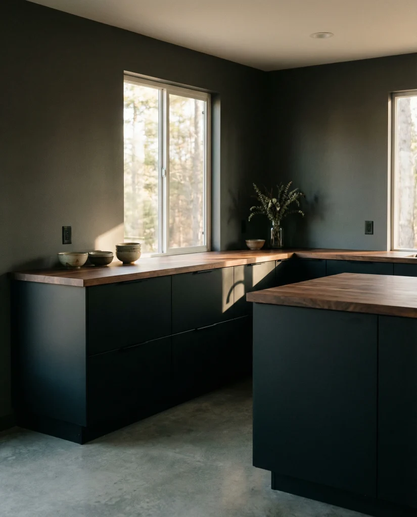 Matte black cabinetry offers bold sophistication, especially when paired with black slab surfaces or butcher block counters for warmth. This look thrives in minimalist 2026 designs, giving the kitchen a sculptural, architectural quality. It’s especially appealing for homeowners wanting a confident, moody statement.