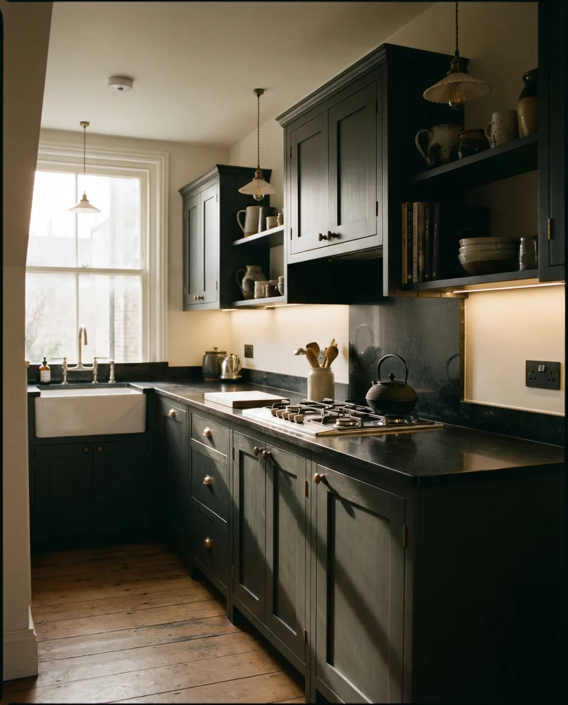 Charcoal colors playing a painted elegance right now were viewed as moody and dramatic for 2026. Paired with black slab counters or dark granite counters, the experience gains a somber depth, which design editors often call “subtly dramatic.” On its own, that color looks deceptively moody and sophisticated when a small space is layered in lighting efforts to modernize and sophisticate it, making it one of the best for it.