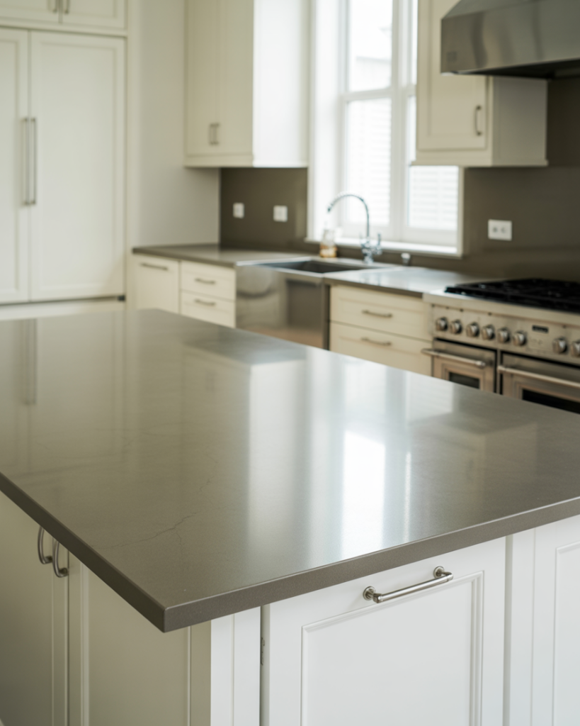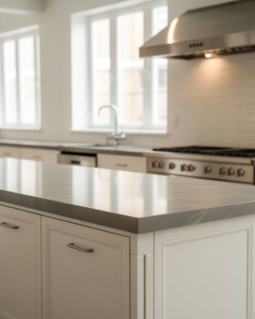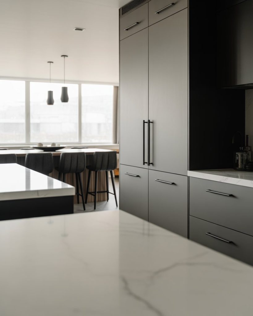 Grey is the perfect bridge between warm and cool tones. Combine a gray countertop with white cabinets and stainless details for a truly elegant result. Designers from Architectural Digest note that grey adds calm neutrality while letting your favorite accessories—from bowls to greenery—take center stage.