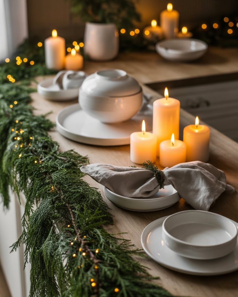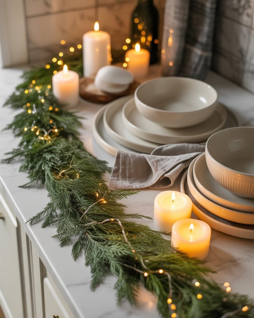 Seasonal decor can make your kitchen feel festive without overwhelming it. Add small Christmas touches—a garland, candles, or a bowl of ornaments. Paired with white ceramics or grey linens, these cheerful islands of ideas bring warmth to cold winter days and spark nostalgia.