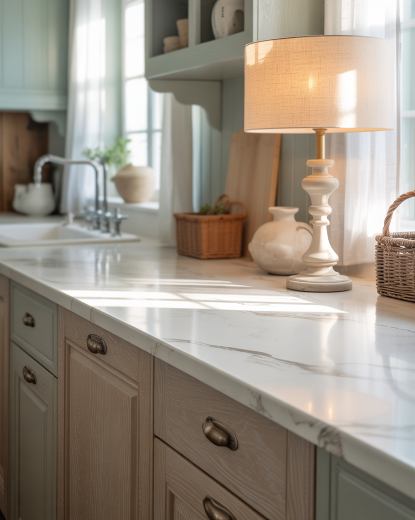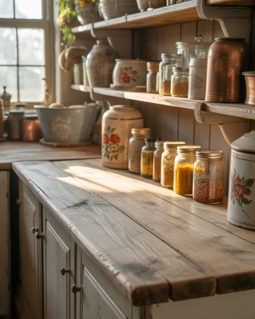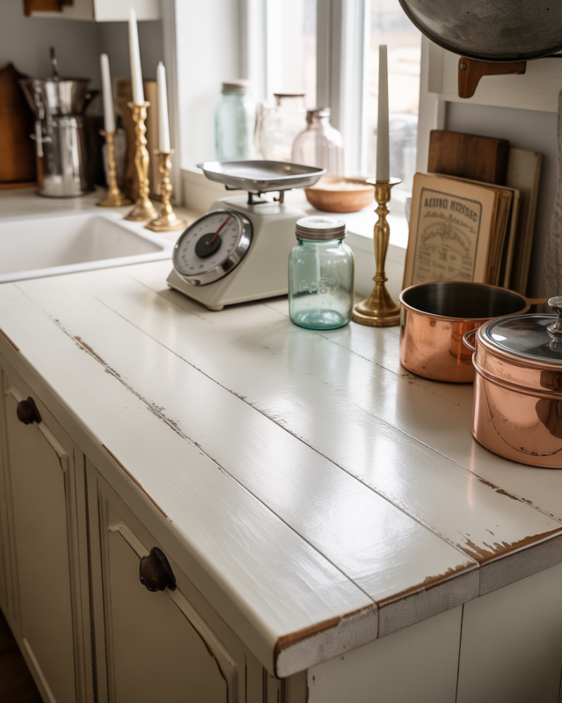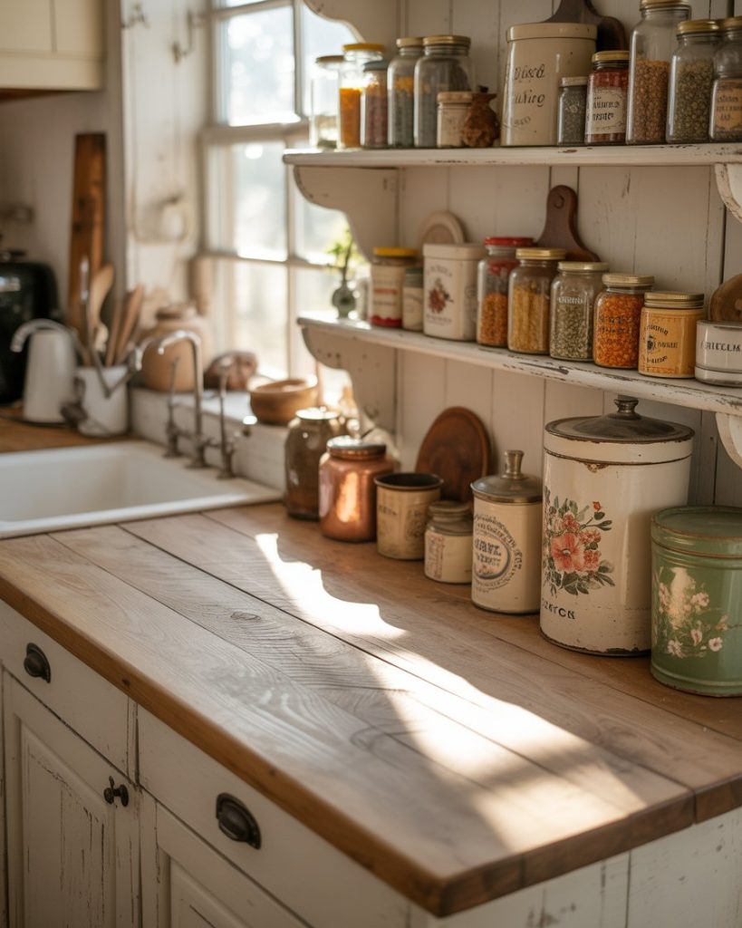 A vintage countertop design brings soul and nostalgia. Think antique canisters, brass handles, and a distressed white finish. Ideas: Modern decorators often mix old and new—pairing retro accessories with clean lines for a curated, lived-in look that feels personal and timeless.