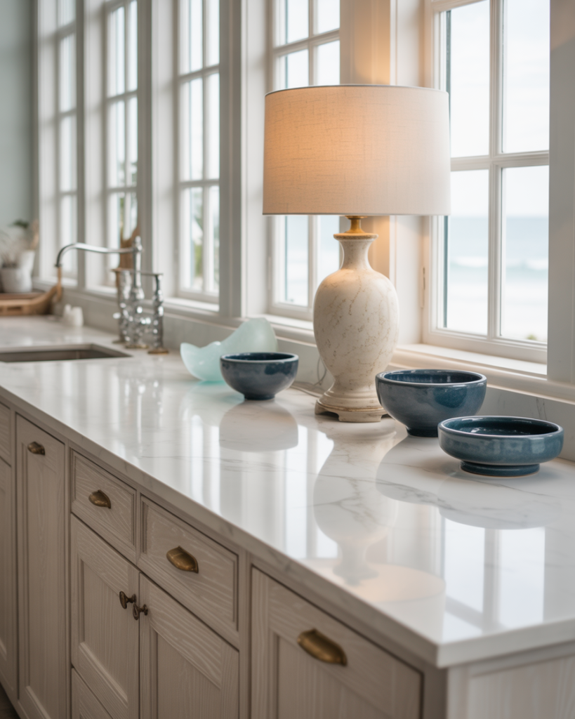 Bring the sea’s tranquility into your kitchen with light woods, woven textures, and white marble touches. Ideas Modern designers often pair sandy tones with soft blues for a beachy feel. Add a lamp with a linen shade for an easy, breezy coastal vibe that feels relaxed year-round.