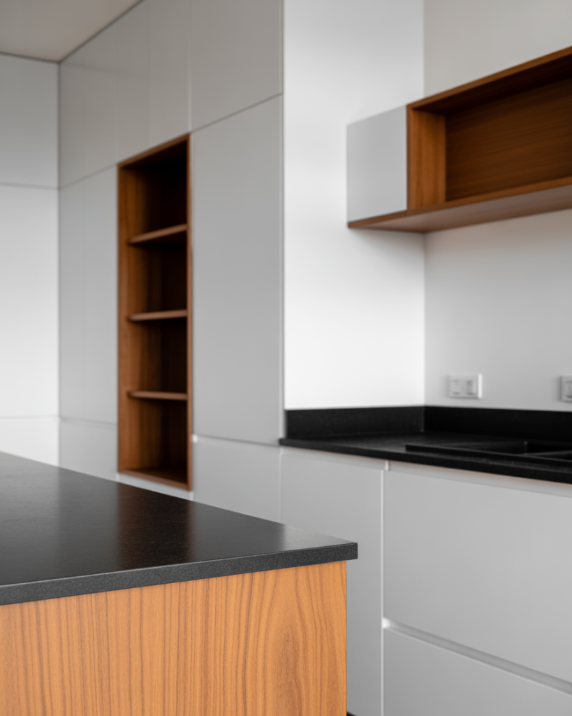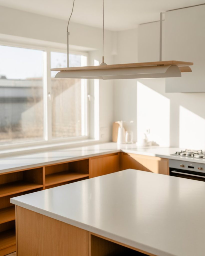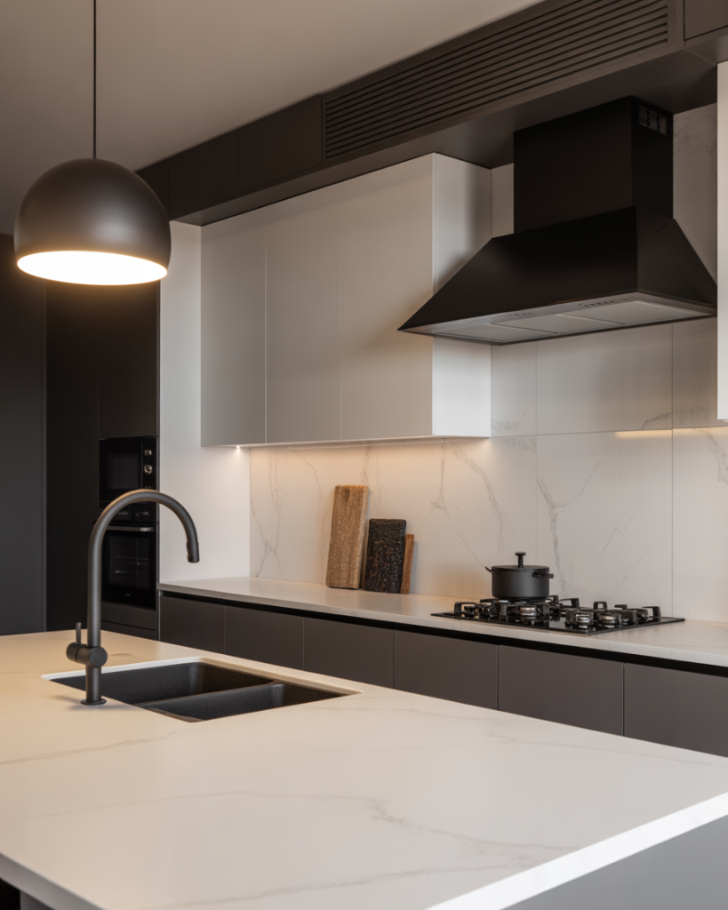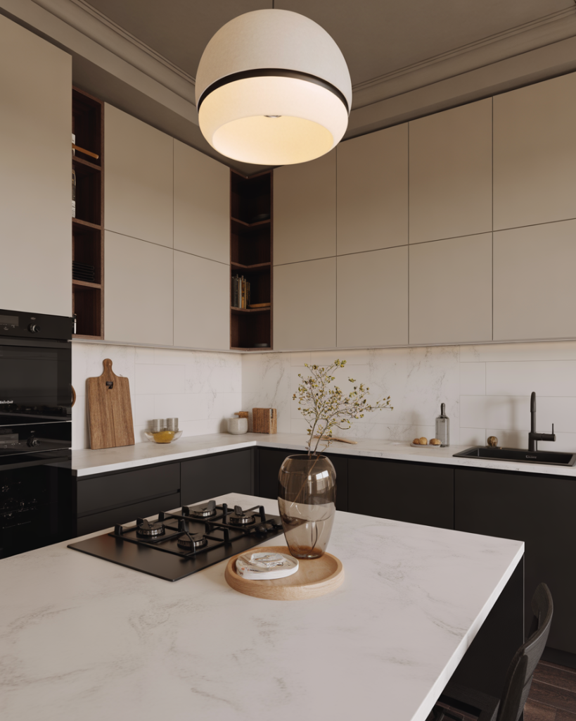 The contrast of white and black has been a timeless favorite in modern kitchens. Use white marble or quartz surfaces paired with black fixtures for visual drama. Add one lamp or pendant light to highlight the countertop, creating a crisp, balanced design that feels both fresh and sophisticated.