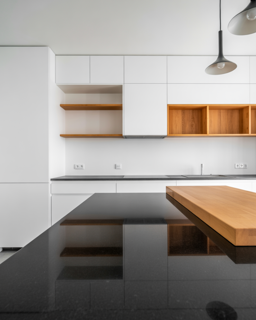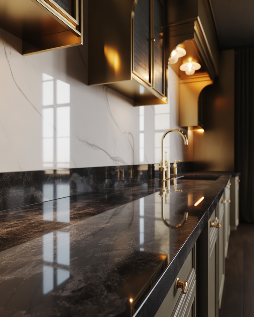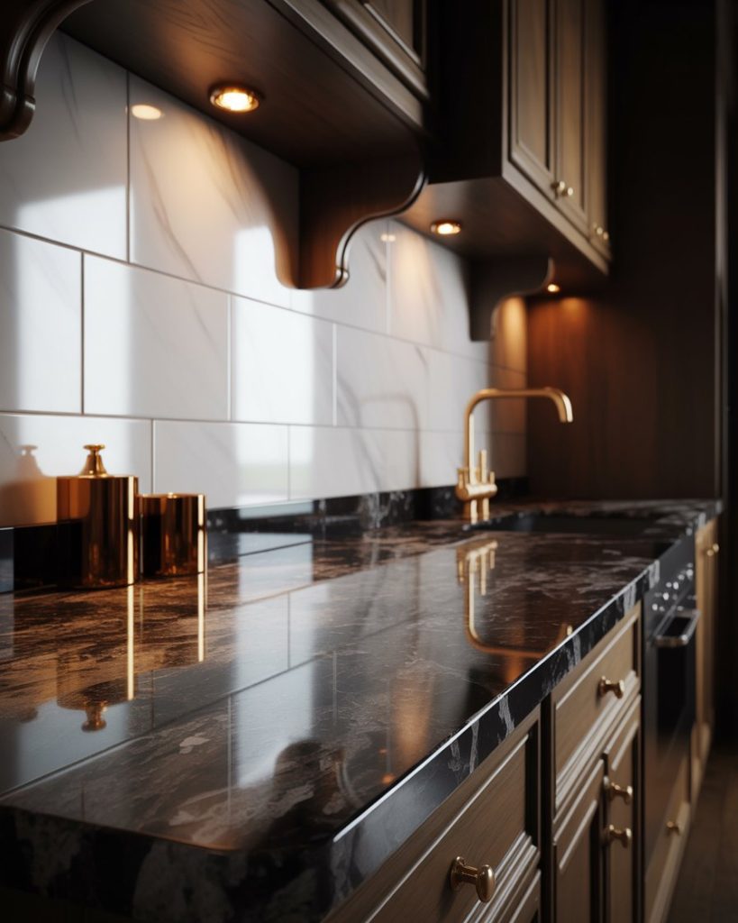 For those who love bold statements, dark granite countertops create instant impact. They look especially stunning with gold fixtures or white marble backsplashes for balance. This modern combination adds sophistication and works perfectly in open-plan kitchens where lighting enhances the stone’s depth.