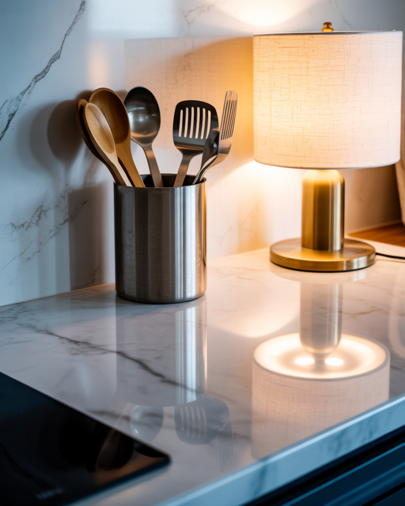 Use narrow trays, small utensil holders, and vertical storage to create some breathing room. Reflective grey or white marble surfaces increase the illusion of space. A lamp in the corner adds warmth without clutter.