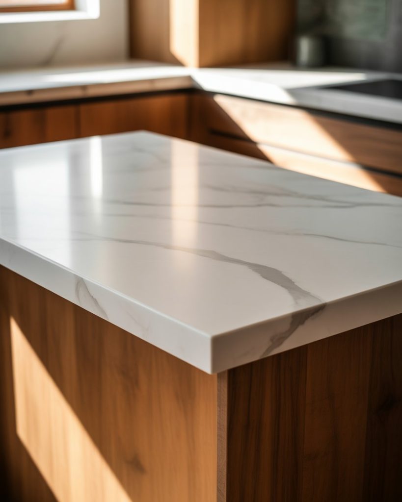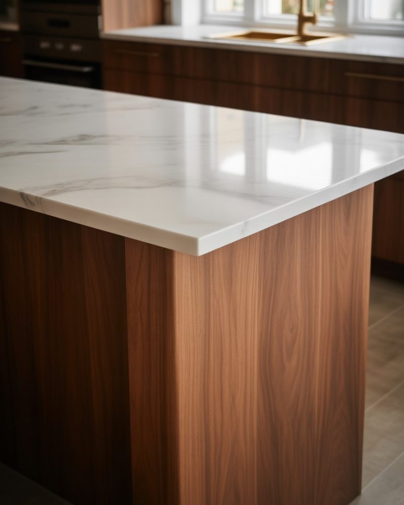 The blend of marble and natural wood creates a balance between luxury and warmth. This modern mix is ideal for designing kitchen islands. The stark contrast of textures draws the eye. The white marble brings a cool air to the room, while the oak wood adds warmth. This combination makes the kitchen inviting.