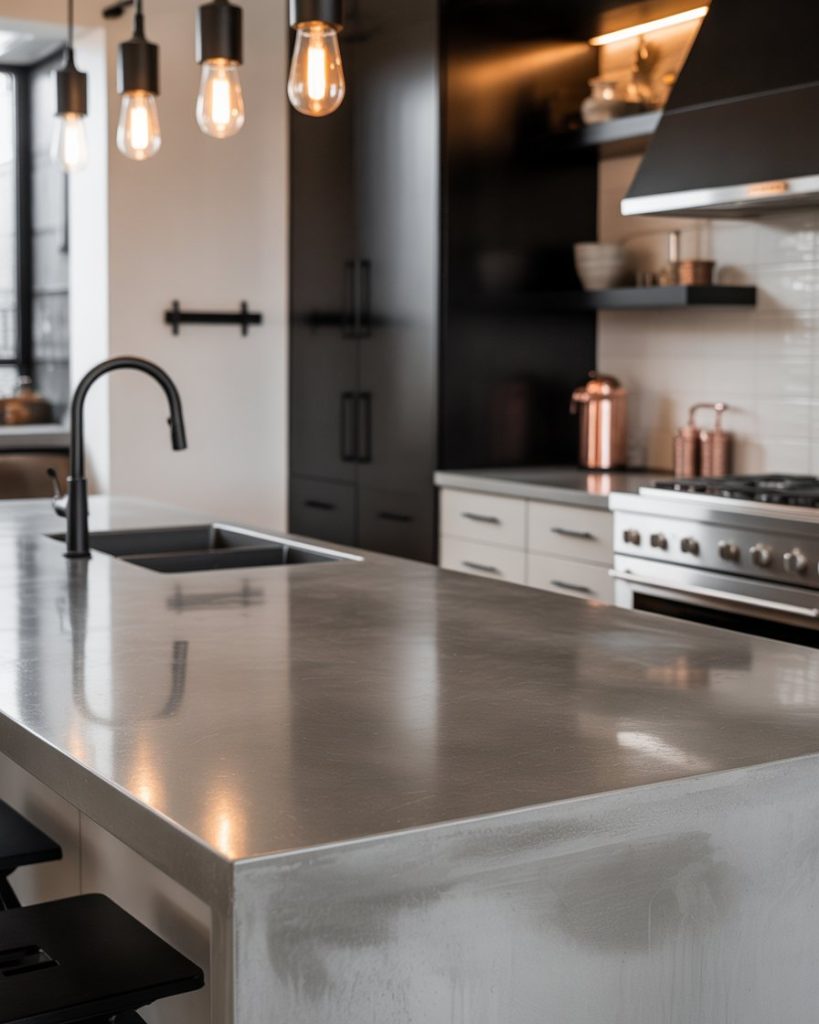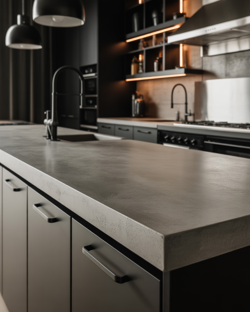 For those who love urban chic, grey concrete countertops harmonize beautifully with black fixtures to create a rugged yet elegant aesthetic. Pair with industrial pendant lights or metal stools for a full warehouse vibe. Modern decorators love the refined finishing along with the balance of raw textures.