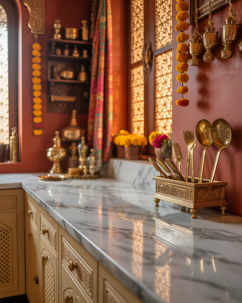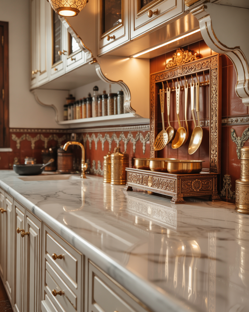 Indian homes often celebrate craftsmanship, and Indian decor ideas with polished marble countertops reflect that grandeur. Combine patterned tiles, gold accents, and traditional carvings for richness. Add an ornate utensil holder to keep the beauty both functional and authentic.