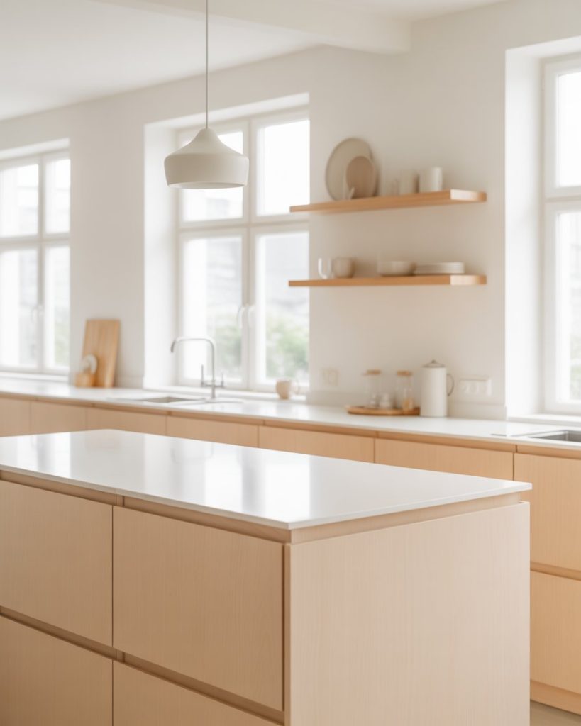 Inspired by Nordic minimalist trends, this look favors light white backgrounds, wood, and simple shapes. Keep your countertop uncluttered with one lamp or ceramic jar for some texture. The light colors calm the mind, and even small areas feel more spacious.
