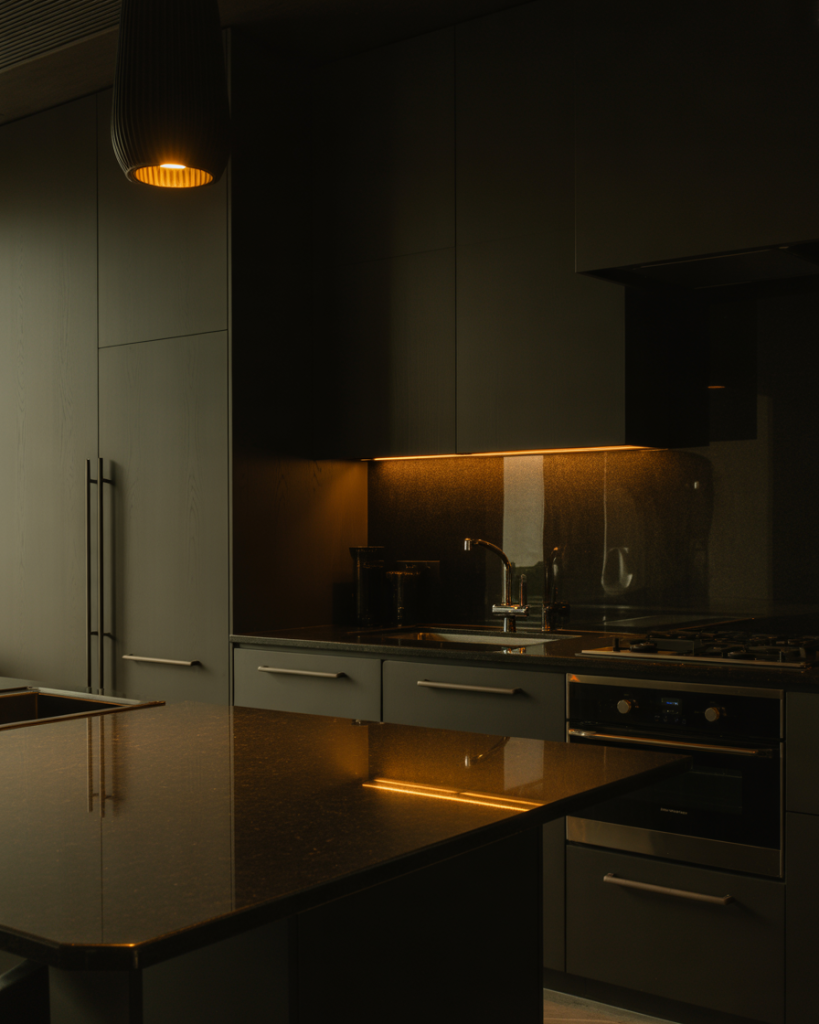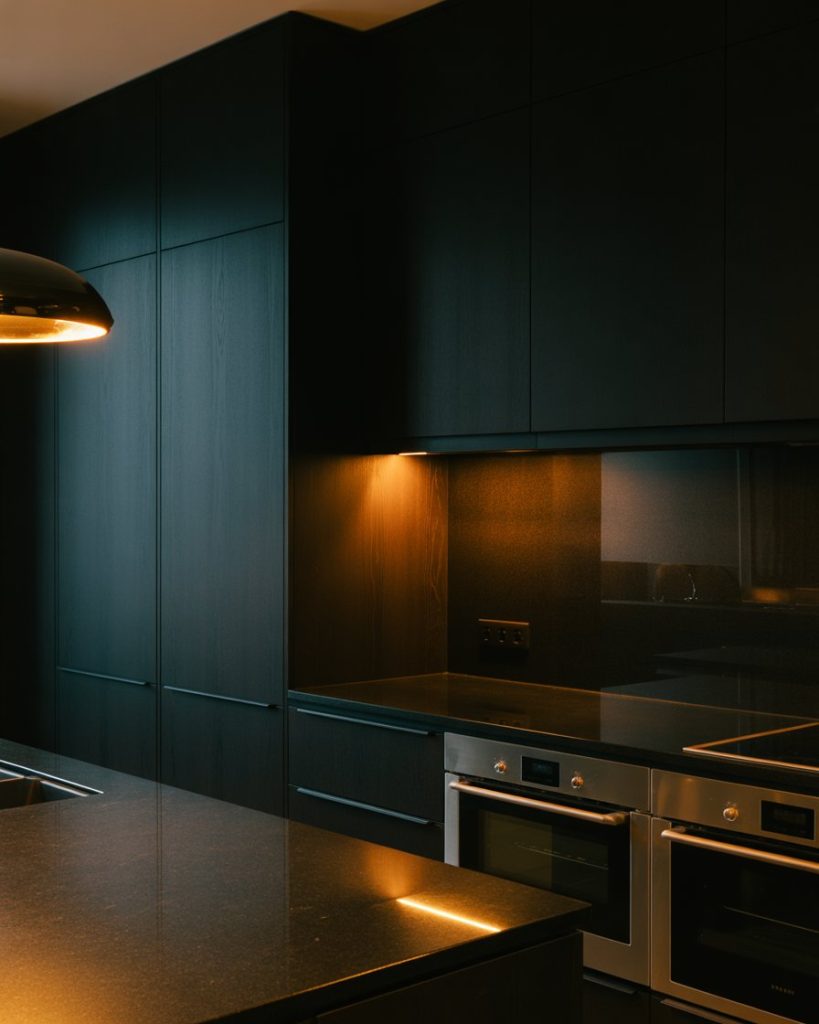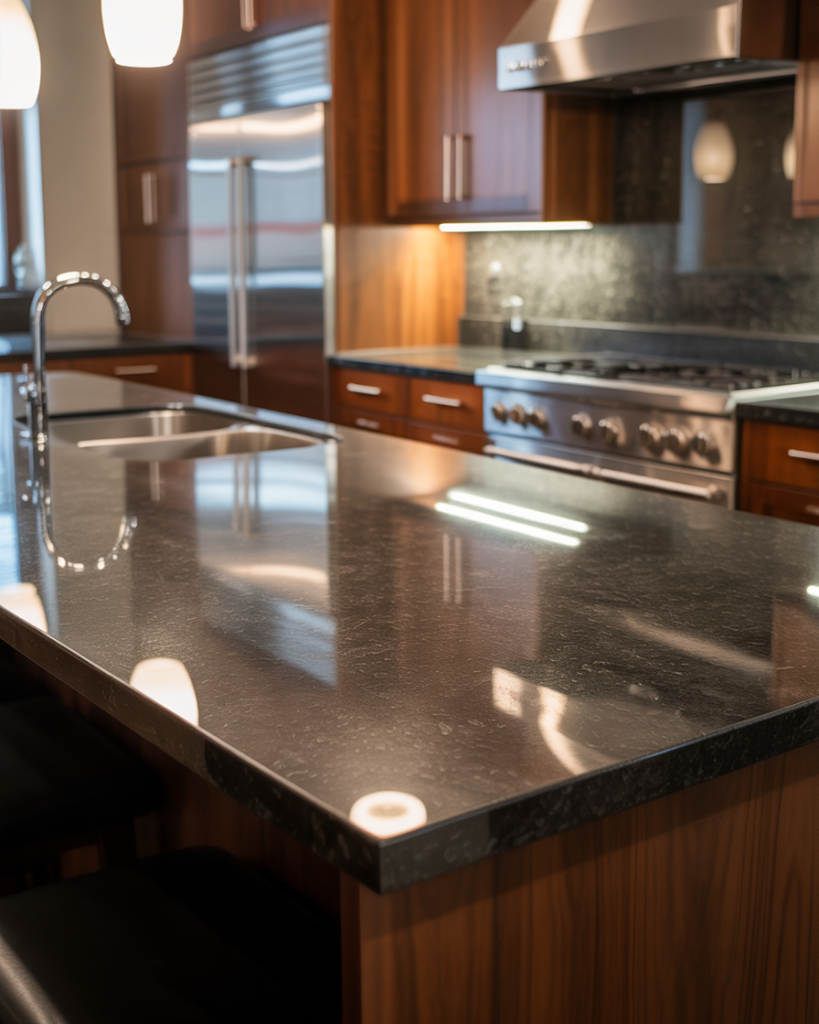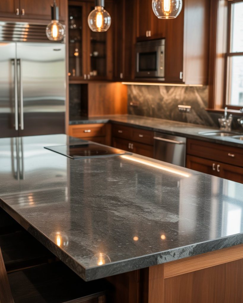 A dark countertop can turn any kitchen into a dramatic statement. Combine matte finishes with a glowing lamp for contrast. Ideas: Modern decorators often choose black or charcoal granite for a luxurious yet cozy atmosphere that feels bold and unforgettable.
