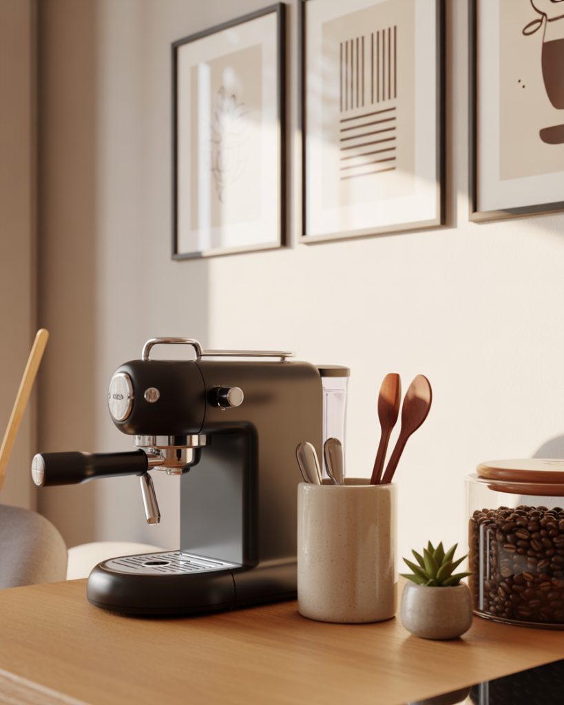 A corner is an area that is often left unused; the addition of an espresso machine and some art prints offers a thoughtful modern touch with minimal occupation of space. Simple small space design ideas make the ordinary moments of the day extraordinary. The modern style and design, together with the fragrance, makes any space wonderful.
