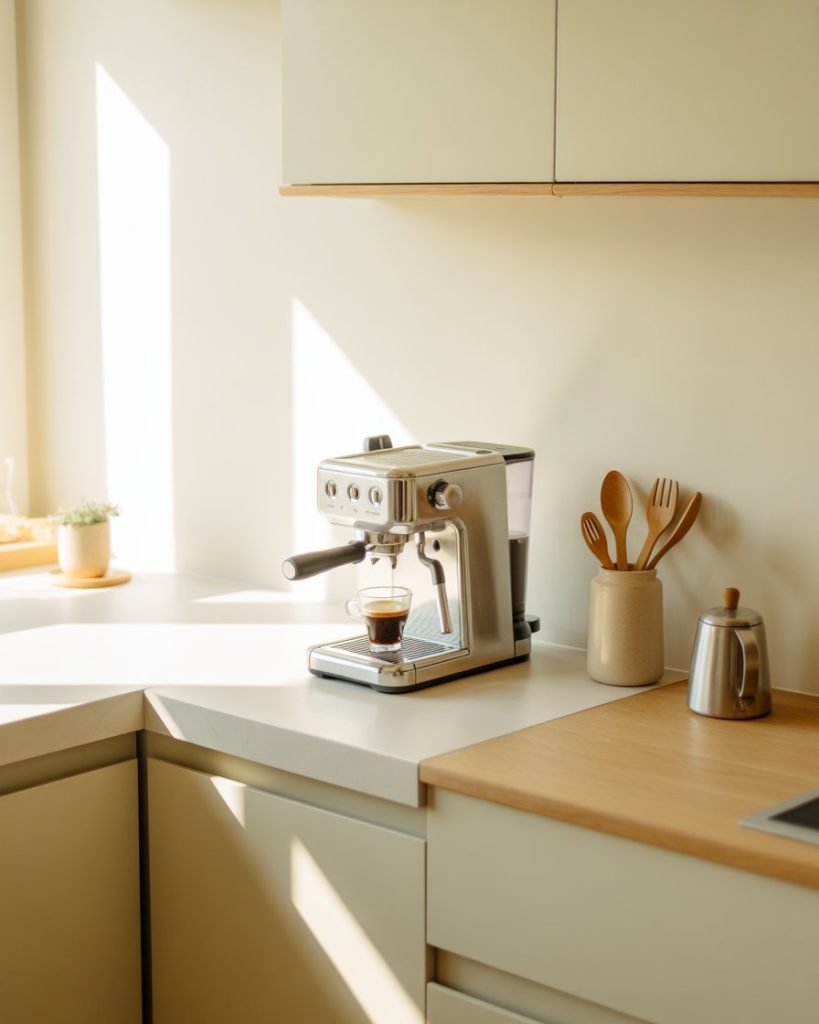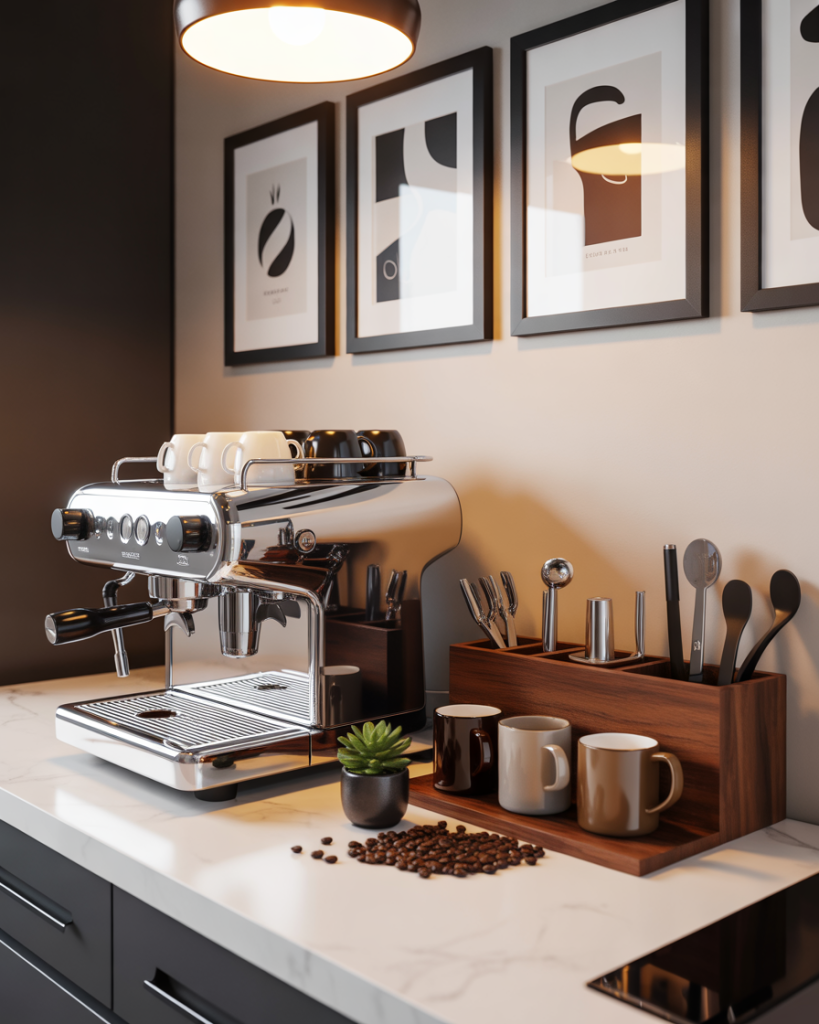 A dedicated coffee corner adds personality and warmth to any kitchen. For ideas for minimalist lovers, use clean trays, a small utensil holder, and neutral tones. The aroma of freshly brewed espresso paired with uncluttered style turns your countertop into a calm morning retreat.