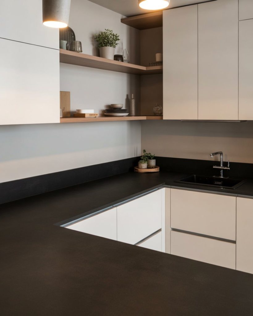 A black countertop instantly makes a modern statement. For minimalist ideas, keep accessories sleek—maybe a glass vase or a single wooden bowl. The contrast of black stone with white walls feels dramatic yet pure, loved by interior experts at The Spruce for its strong visual impact.