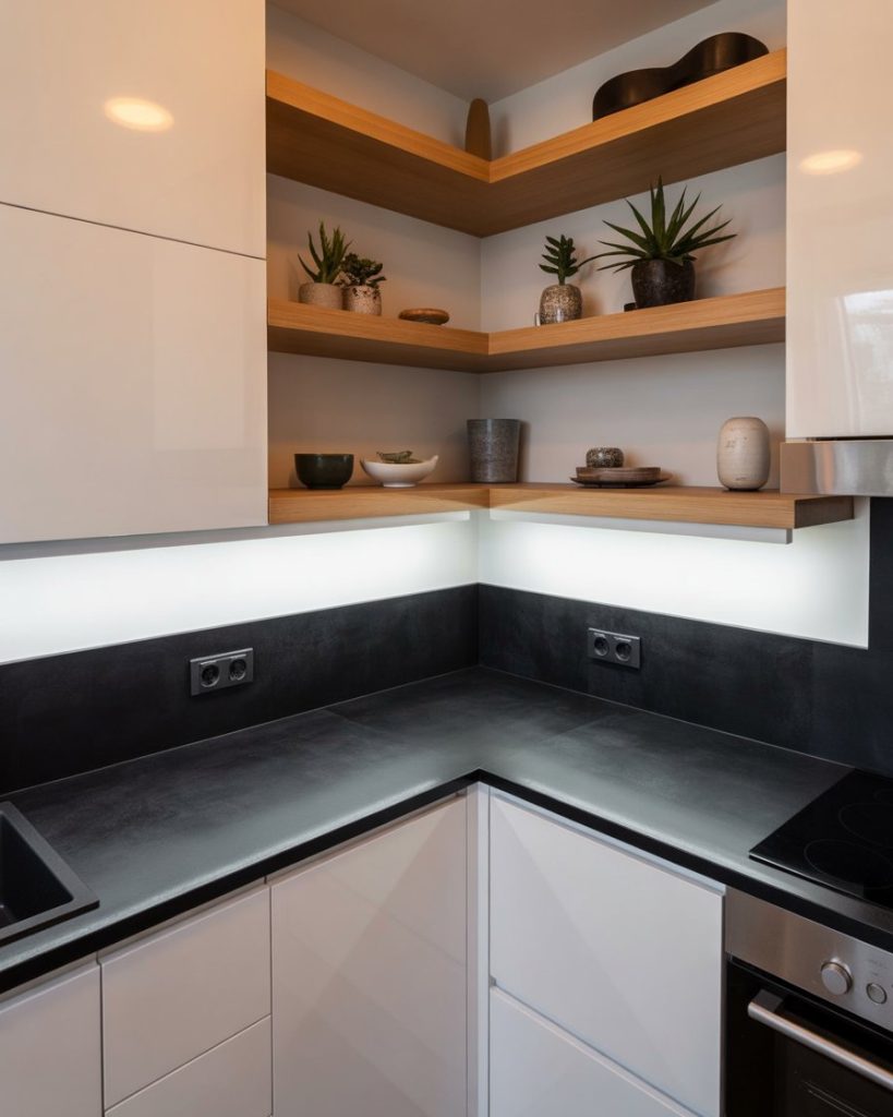 When space is tight, a modern corner setup can turn unused areas into stylish focal points. Choose sleek lines, black matte finishes, and compact appliances for small spaces that look both functional and chic. Designers from Apartment Therapy recommend floating shelves to maximize every inch.