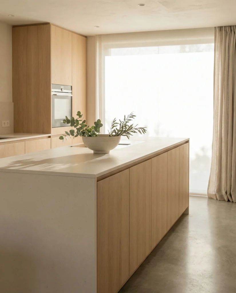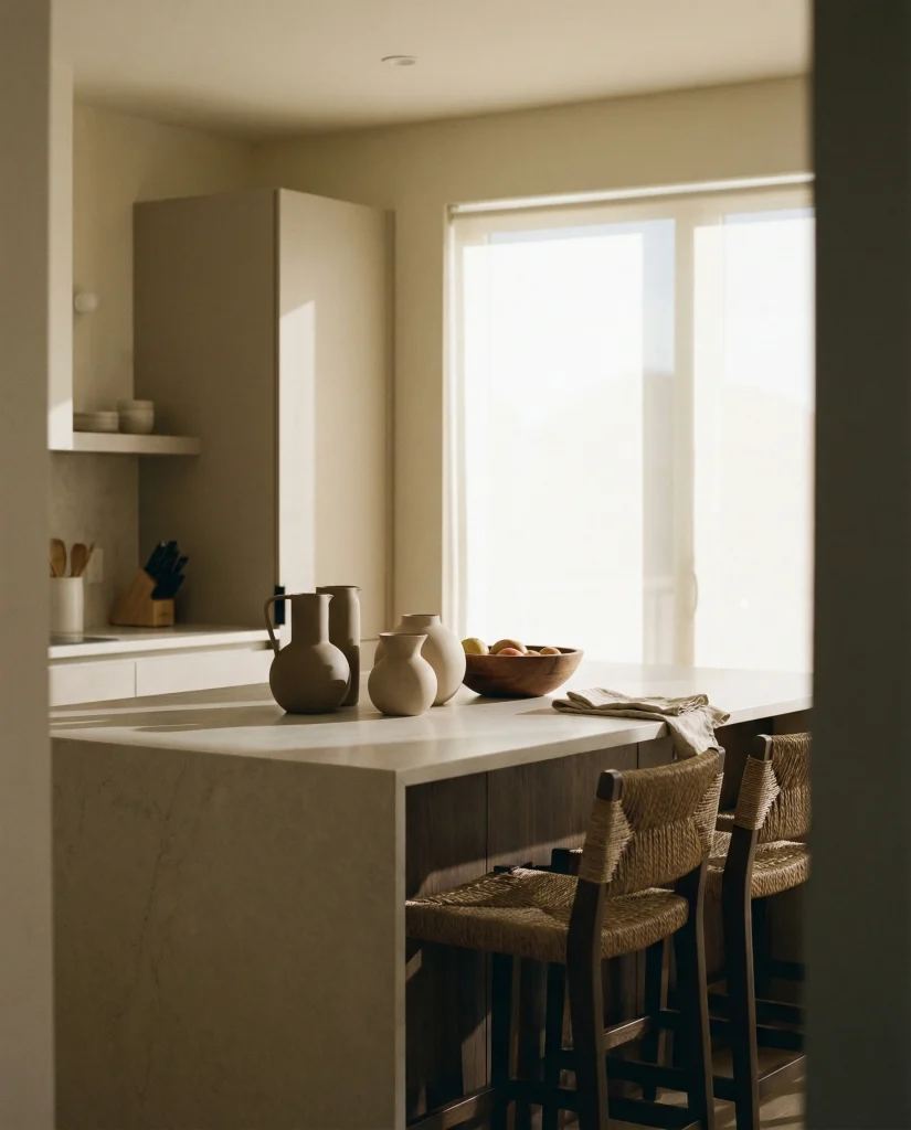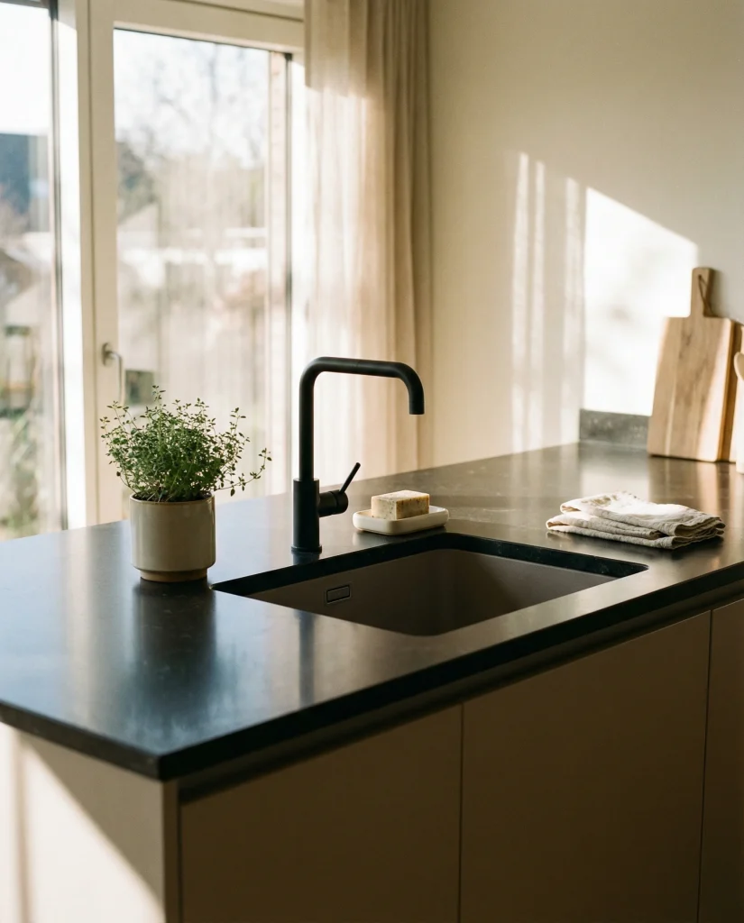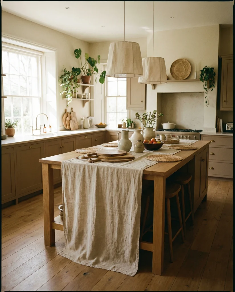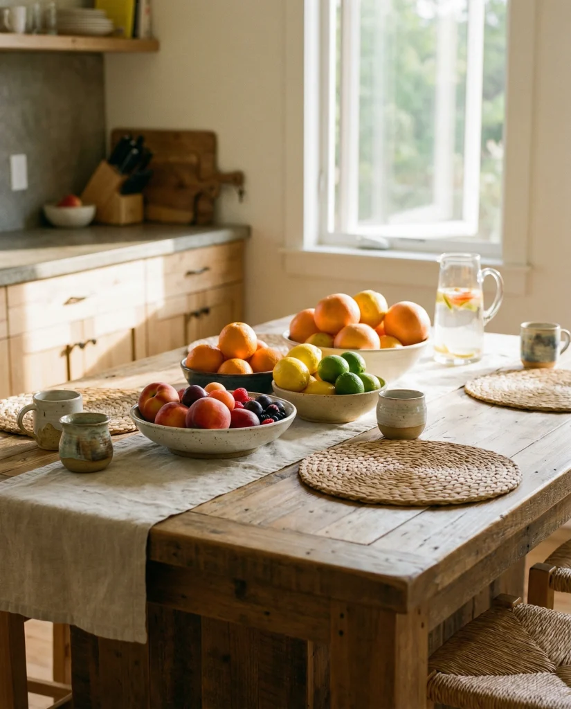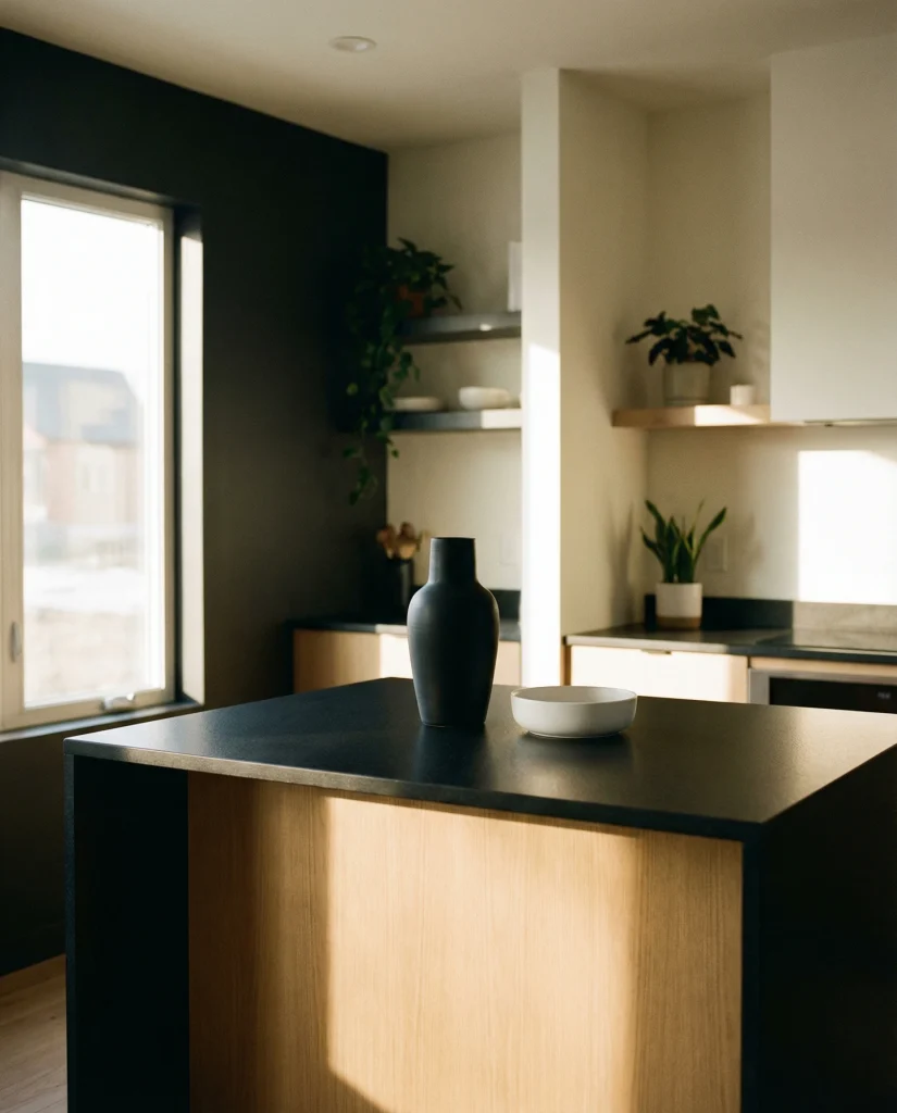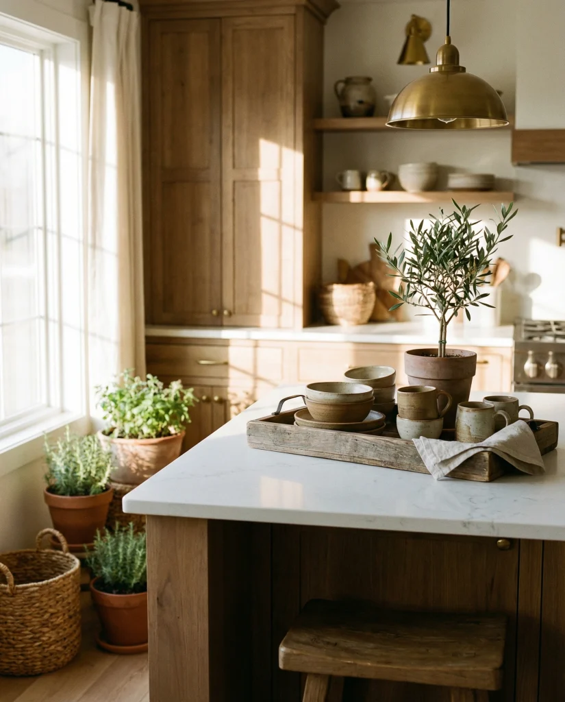 Your kitchen will have so many black and white elements, following what is presently dominating 2026 interiors. Bold matte-black vases and white flat ceramics, combined with very linear styling, provide extraordinary contrast for simple and busy family kitchens. This contrasting structure does not look harsh, by any means, especially with warm lights.