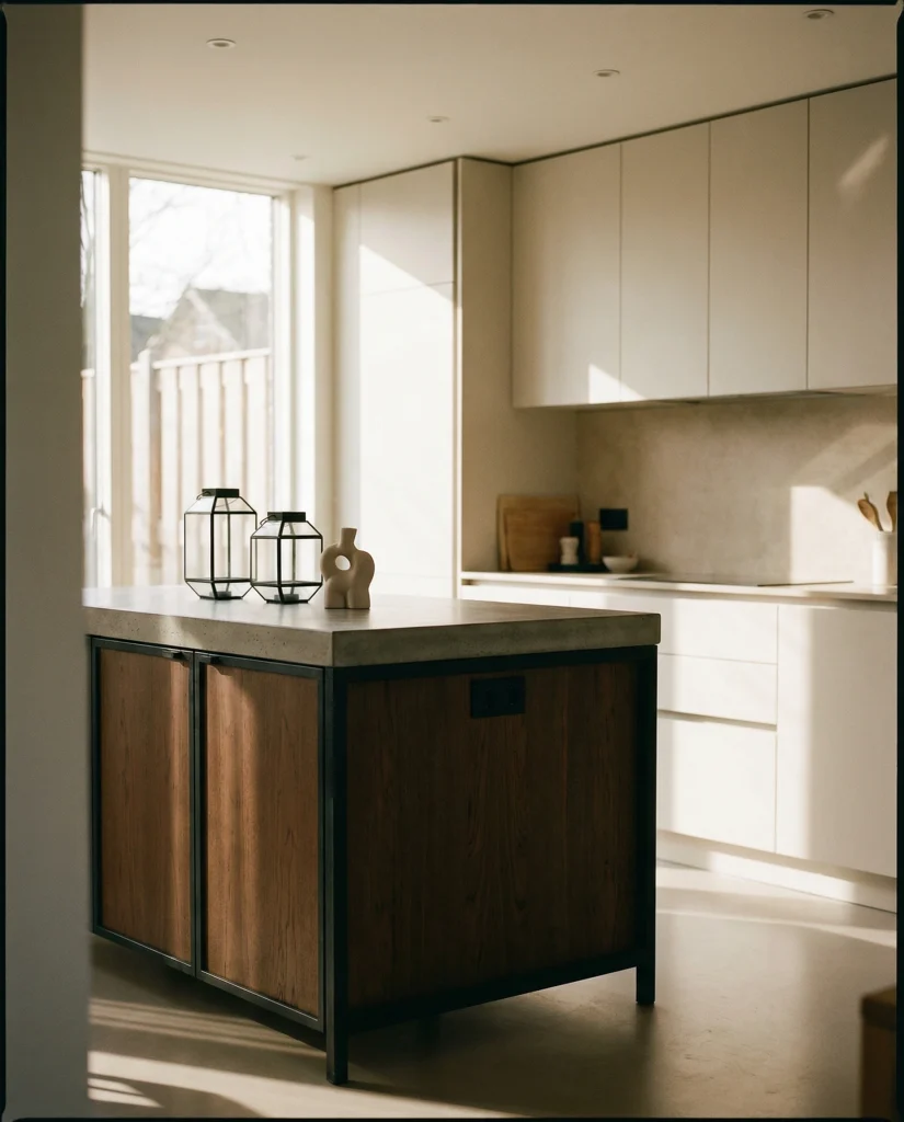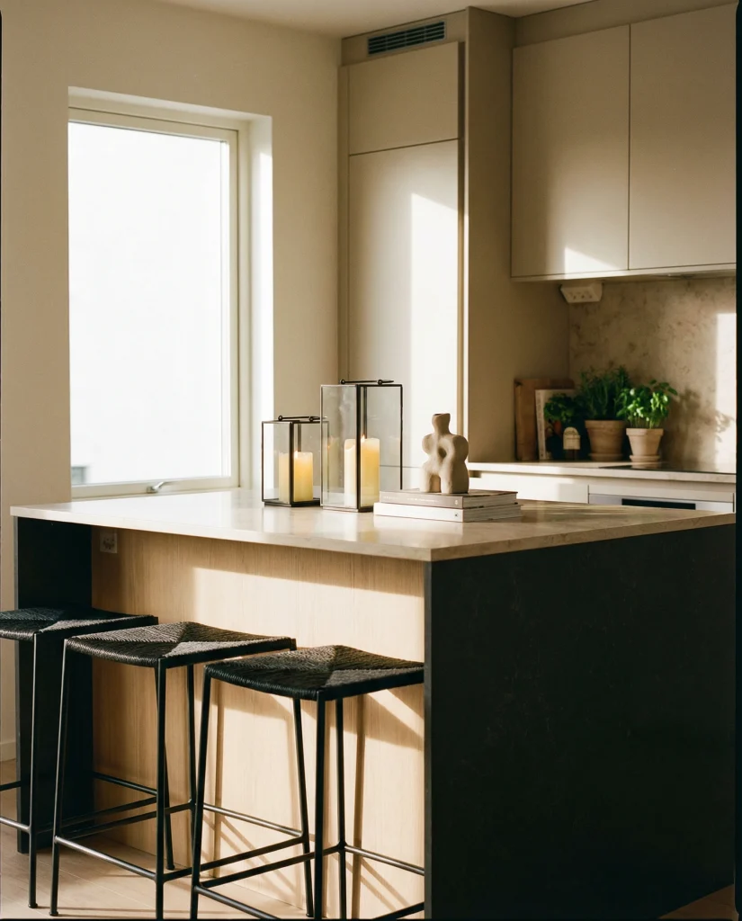 Adding a black bit, either an iron lantern or a frame, contrasts beautifully with an otherwise feminine space yet-gives it a unique look in modern kitchens. A small island too becomes visually substantial with that final dark addition. It instantly adds to a heavier look with both white cabinetry and stone counters. I’ve noticed how the approach always feels so deliberate in rendering those neutral kitchens more intentional.