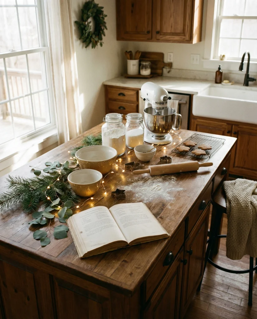 Going as simple as just a smallbaking tableauu with a cookbook, mixingbowl, and, smidgeon of green is full of nostalgia and burns the heart for the holidays. Its very presence in a kitchen makes one slow down and appreciate the wooden beams o…..