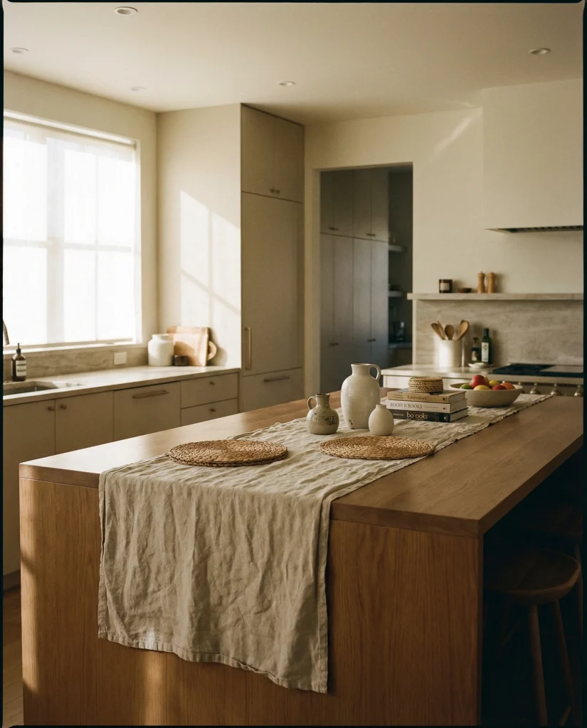 A slim linentable runnerr adds some dignified lines to a long kitchenisland, keepingg the eye flowing and preventing the stark, hollow appearance when it’s too long. A newer building’s islan—sometimes oversized—lightss up withtheses sleektracks—aa wonderful aide-propre for seasonal decor.