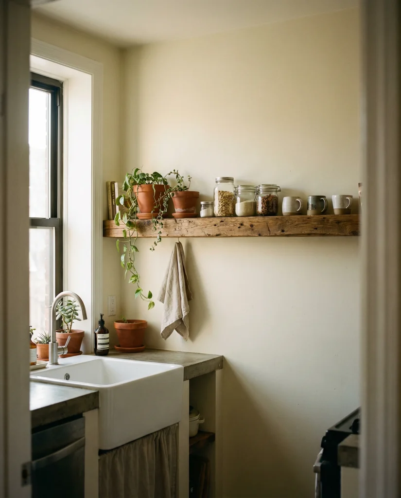 Aesthetic over-the-sink shelving is a good form of vertical and clever organization. A friend installed a wooden shelf for her plants, soap, and brushes, making her tiny apartment kitchen feel cozy. It is great for people who live in something of a small space or style lovers!
