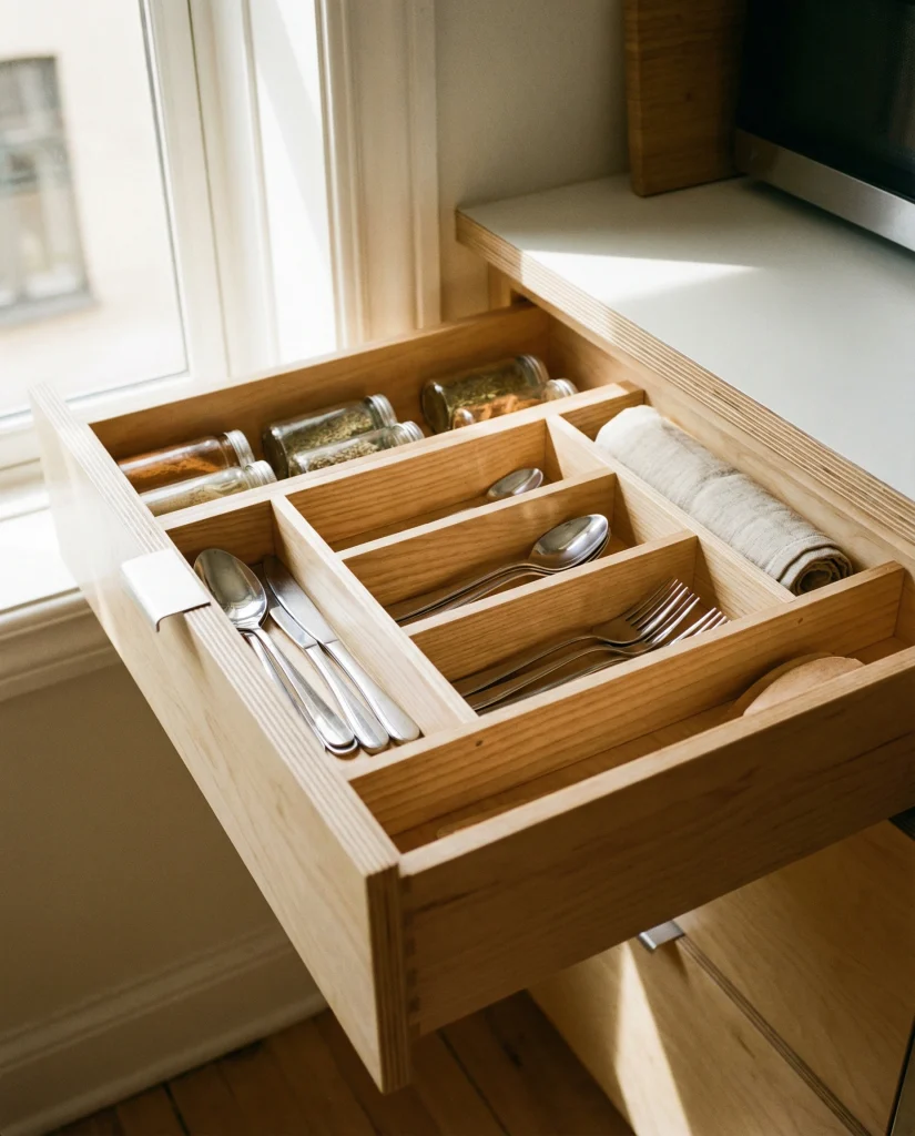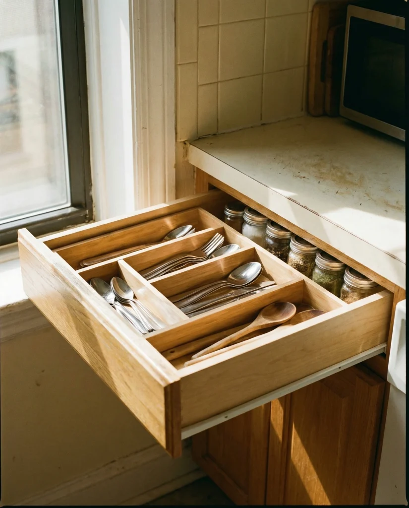 Making DIY drawer inserts can conquer the quicksand in deep drawer chaos and prevent the terrible looming scenario besides the kitchen sink of pans, knick-knack gadgets, and some simple tools in DIY, Drawer, Tiny, and Simple kitchens. Imagine one lady putting a bunch of craft sticks as dividers for quick, organized access on the helpful weekend project base—looking the husband’s way while she did it—and she absolutely loved the final look. This hands-on approach is cheap, adjustable, and surprisingly satisfying.