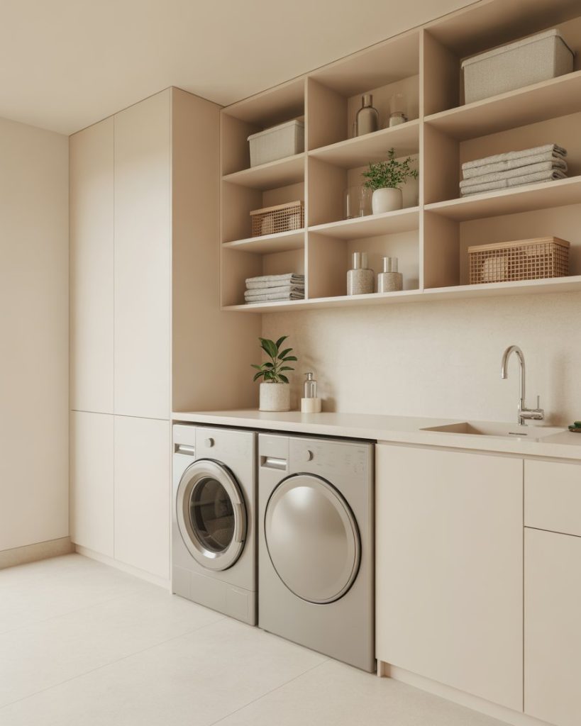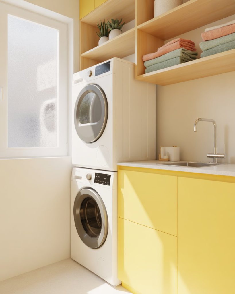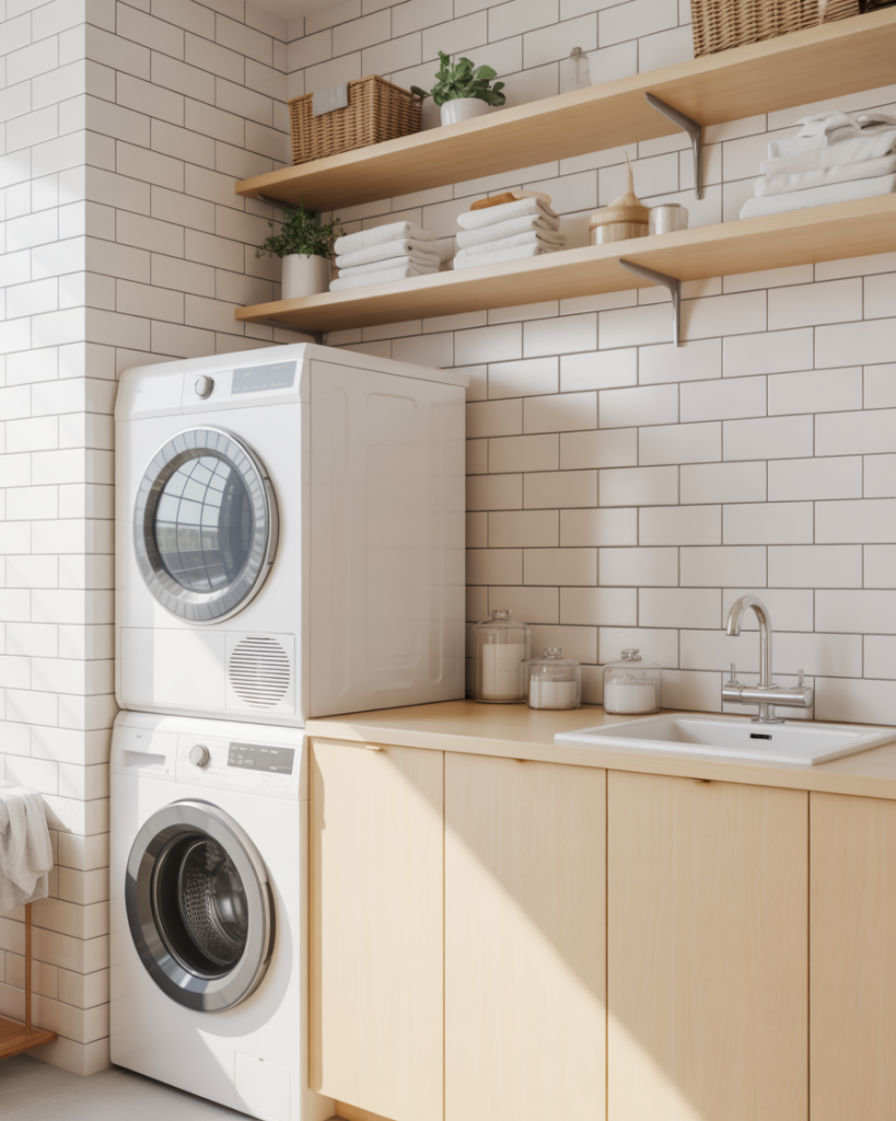 A simple Scandinavian-style laundry room focuses on clean lines, natural textures, and light tones. Combine pale wood shelves with white tiles and a stacked washer dryer to create an airy and small space-friendly atmosphere that radiates calm and order.